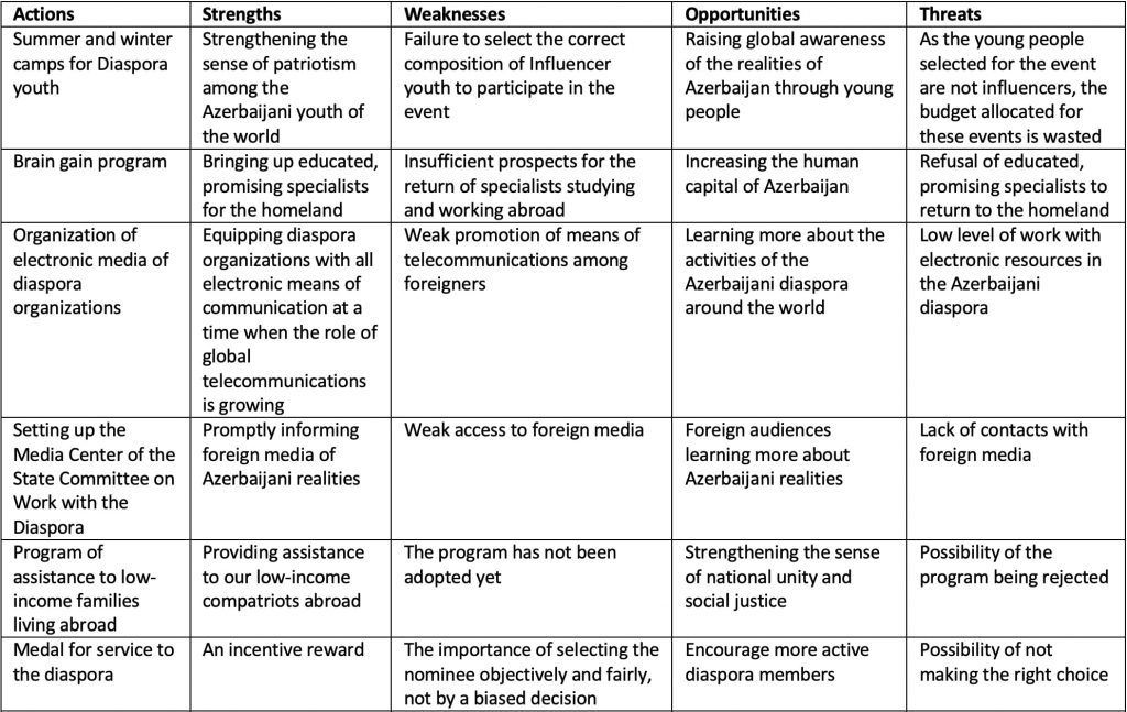 Table: SWOT Analysis of the activities of the Azerbaijani Diaspora in 2019