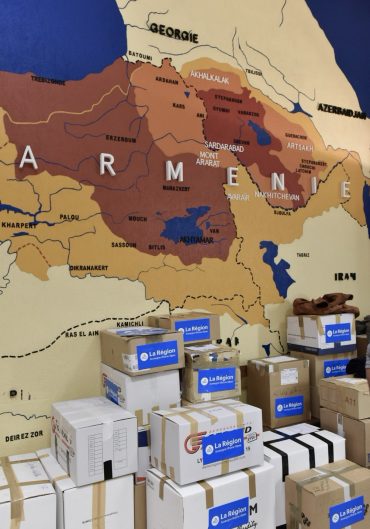 The borders of the Armenian and Azerbaijani states established in 1991 after the collapse of the USSR are known to the entire world. We can even go back a little and mention the fact that Karabakh was recognized as the territory of Azerbaijan at the same time (January 1920) as the Azerbaijani and Armenian republics, both established on the same day on May 28, 1918, were recognized de facto by the world powers at the Paris Peace Conference. However, the Armenian citizens and the Armenian diaspora living abroad, who ignore all this, lost in the euphoria of their fabricated “ancient history”, were seriously mobilized to get their claims and lies across to the world. Their claims are even so persistent that the French, the strongest political and moral supporters of the Armenians, are not afraid to publicize this “Greater Armenia” map at major events. For example, on October 5, 2020, an event organized by a former President of the French Republicans Laurent Wauquiez in the Auvergne-Rhône-Alpes region of France featured a map of Greater Armenia showing the eastern regions of Turkey and the western regions of Azerbaijan within the Armenian border. The event was organized in support of the Armenians in the recent events in Karabakh, and the boxes of medical supplies in front of the map were the humanitarian aid to be sent to the Armenians (photo from Twitter @laurentwauquiez). Undoubtedly, this event was held with the support of the Armenian diaspora.