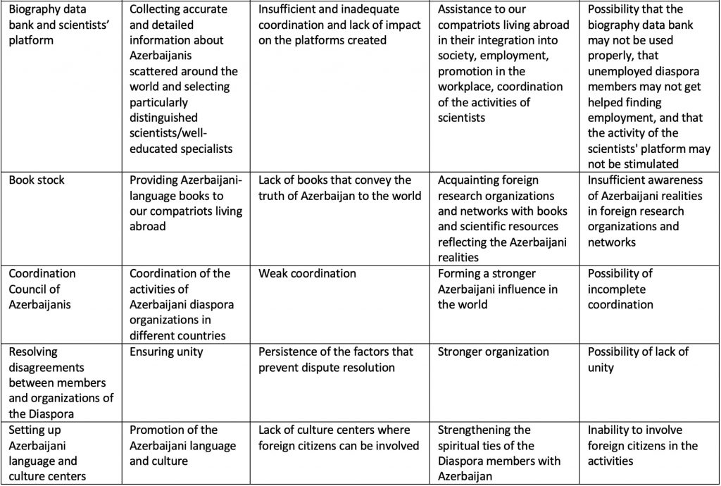 As can be seen from this SWOT Analysis prepared on the basis of the 2019 Annual Report of the State Committee on Work with the Diaspora, although the main efforts of the Azerbaijani Diaspora are focused on propaganda, this activity is more oriented towards the Azerbaijani community and very weak on foreigners. In the future, assistance should be provided to the employment of Azerbaijanis living abroad in local administration, government and other bodies of their host countries, in general, to the adaptation and development of Azerbaijanis in their countries of residence, and their participation in local governance. Thus, attention should be paid to establishing a mechanism of influence on foreign countries, cooperation with foreign politicians and public officials, in particular, strengthening contacts with foreign media. The organizational aspect of all this can be mastered by studying the work of the Jewish diaspora, which managed to establish one of the strongest diaspora organizations in the world.