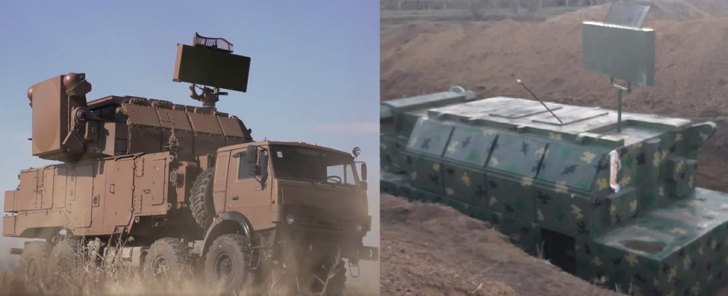 Left: An Armenian Tor-M2KM SAM system as it operated during the 2020 Nagorno-Karabakh conflict. Right: An elaborate Tor-M2KM decoy featuring the standard camouflage pattern applied by Armenia on its military vehicles