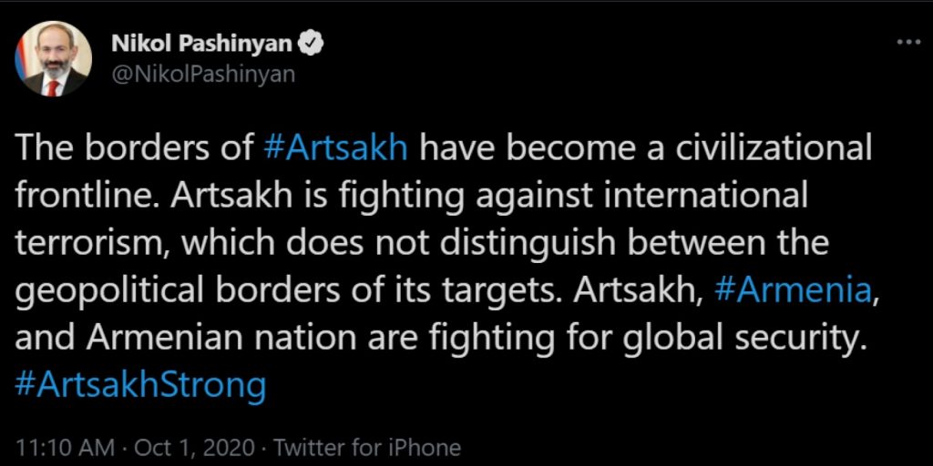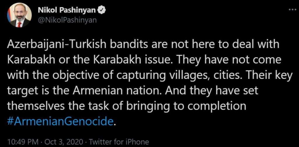 Another ramification of Pashinyan’s narrative was the presentation of the Armenian– Azerbaijani conflict as a war on religious grounds, or a civilizational war of “Armenia against nonhumans (terrorists, barbarians, bandits, devils).” Here, one can clearly see the dichotomy, according to which the civilized and cultured representatives of the highest (super) race, the Armenians, have to fight against a “lower people,” the non/subhumans, barbarians, and nomads that are Azerbaijanis.