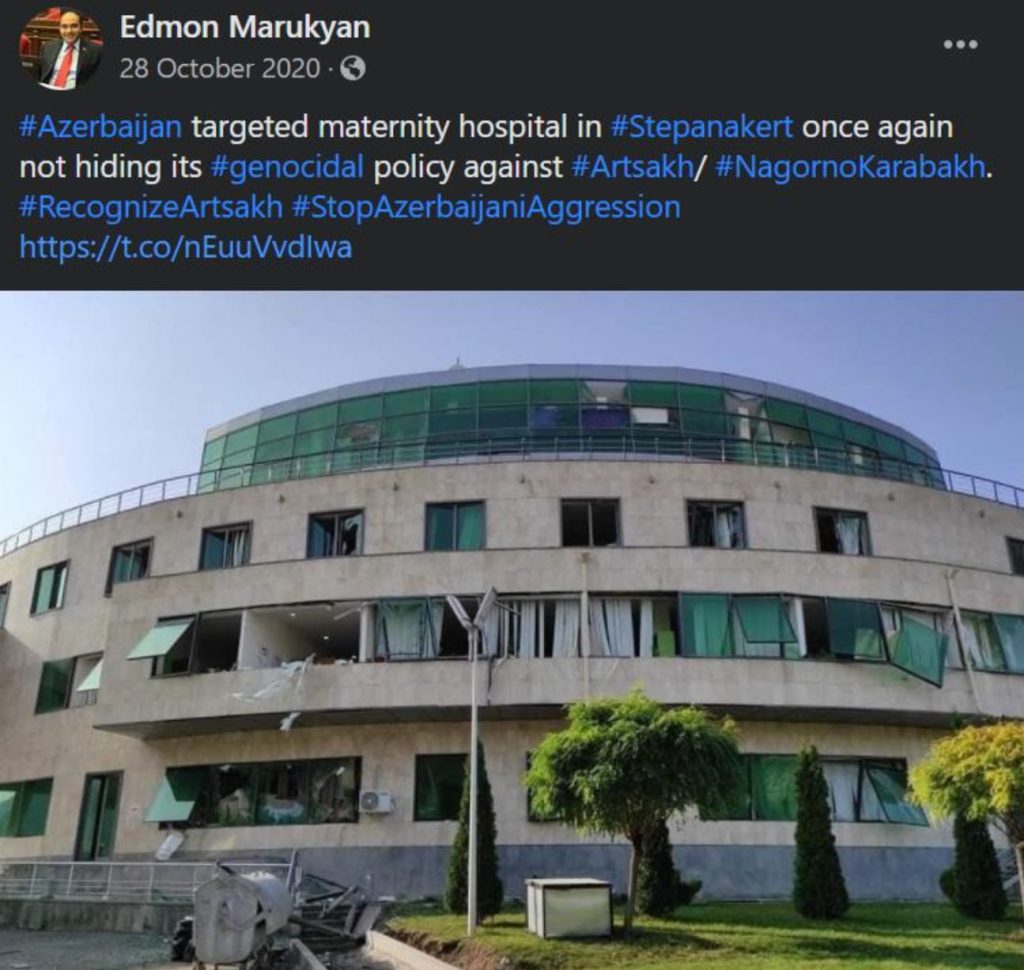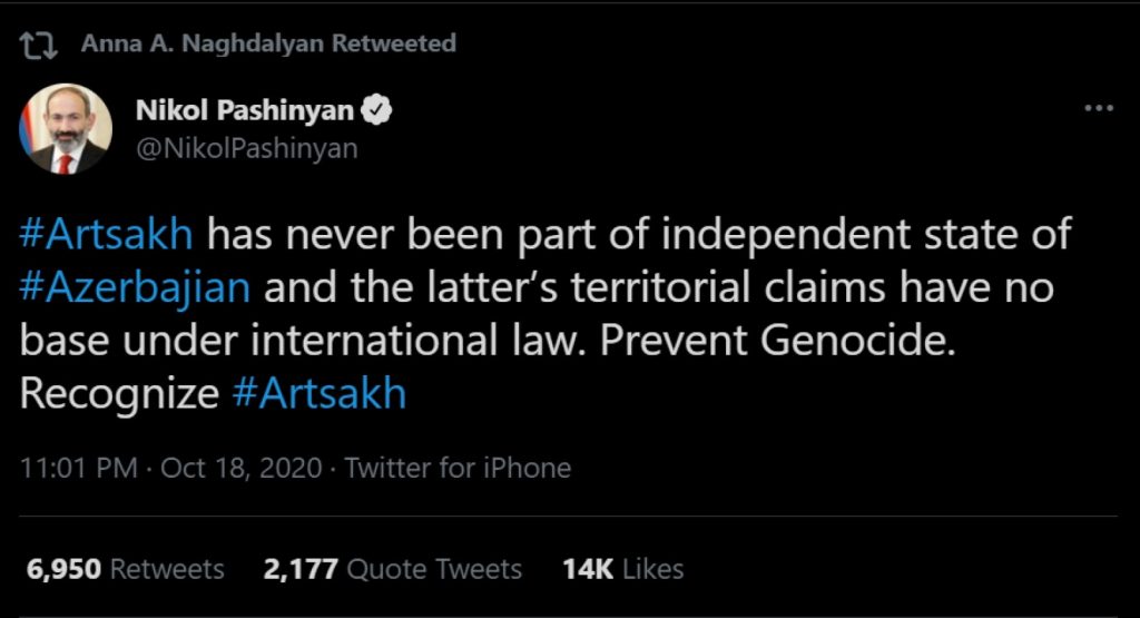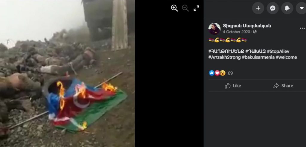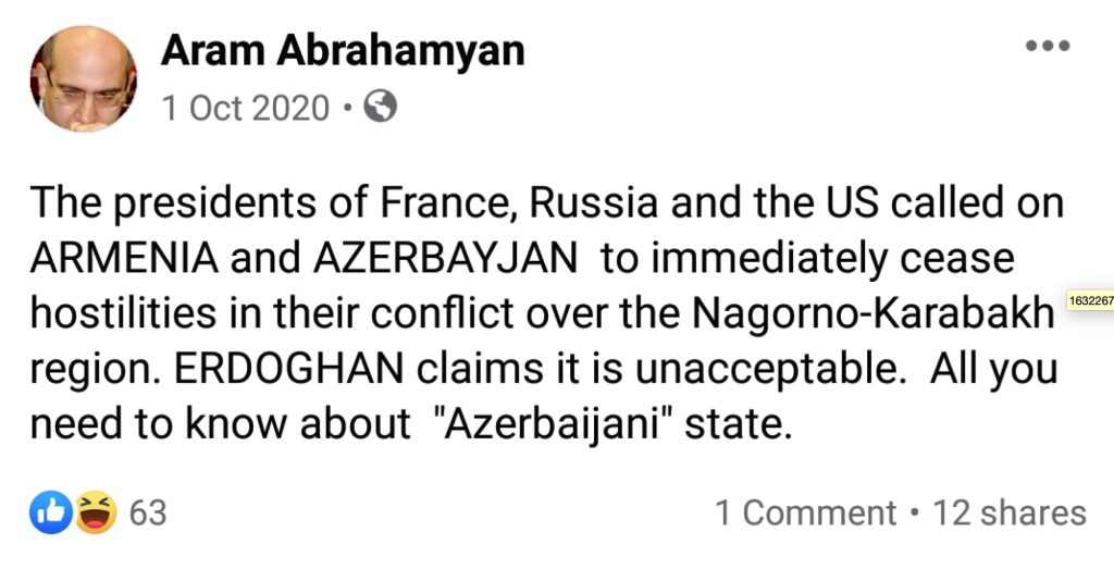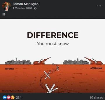 In the following image, Armenian opposition leader Edmon Marukyan has shared a photo that portrays the brave Armenians who defend their people against the “cowardly” Azerbaijanis (more precisely, the Azerbaijani army) who are placing the Azerbaijani civilian population against the Armenian army. Even more interesting is the hashtag through which one can find similar images: #HumanityVsAzerbaijan, or Humanity opposed to Azerbaijan, is a vivid example of the dehumanization of the country and the Azerbaijani people in general. It should be noted that there are over 22,340 subscribers to Edmond Marukyan’s Facebook page.