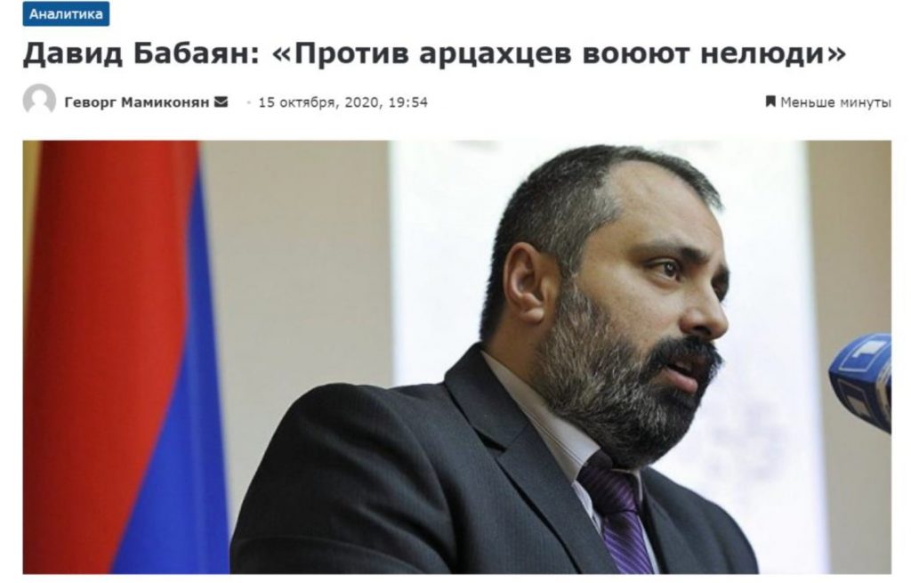 Simultaneously, the officials were also promoting the narrative of Azerbaijanis being “non-human” or “subhuman.” During the Second Karabakh War, David Babayan, recently appointed to the so-called position of “foreign minister” of the Karabakh Armenians, expressed the opinion that “non-humans” are fighting against the Karabakh Armenians: “Non-humans are fighting against the people of Artsakh, and talking about any of their human qualities is not necessary.” Then Babayan emotionally repeats: “But anyway, we will break them.” The same narrative can also be found on Armenian news portals.