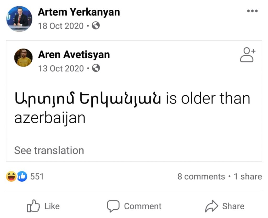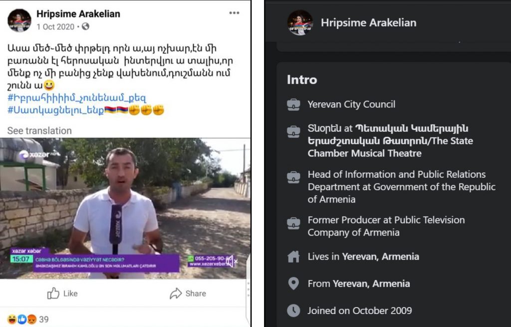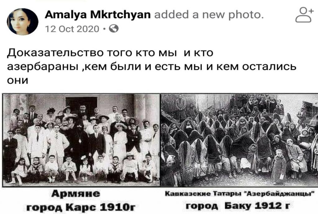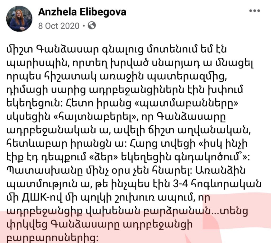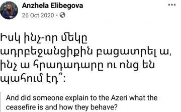 This person, who has been trying so carefully to prove the presence of Armenophobia in Azerbaijan, herself repeatedly dehumanizes, belittles, and devalues Azerbaijanis. During the hostilities in October of last year, after another ceasefire agreement, Elibegova shared a status on her Facebook page in which she belittled the Azerbaijani people and asked “can anyone explain to the Azeris (Azerbaijanis) what a ceasefire is and how it is necessary to act in this case?”