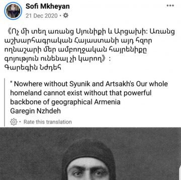Armenian singer Sofi Mkheyan was also quite active during the war and the post-war period. The singer, who compares Azerbaijanis to the devil, shared revanchist quotes after the war, including one by Garegin Nzhdeh, stating: “Nowhere without Syunik and Artsakh. Without this strong backbone of geographic Armenia, our integral homeland cannot exist.”