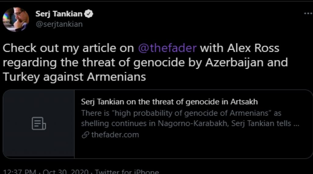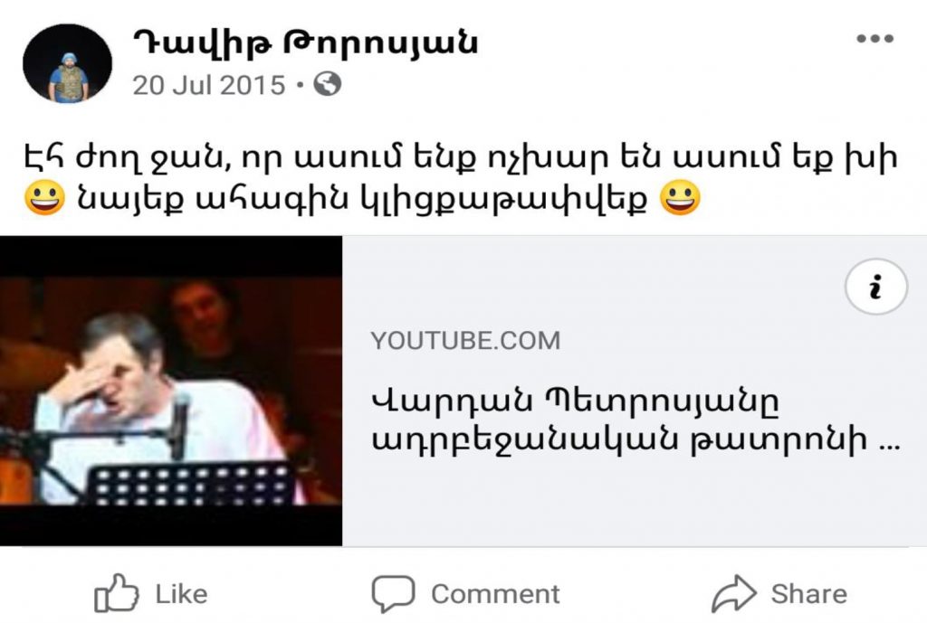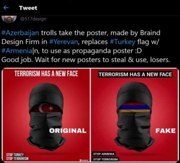 Sedrak Mkrtchyan tweeted about how Azerbaijani trolls took an Armenian poster, modified it, and used it as propaganda. At the end, Mkrtchyan notes “Wait for new posters to steal and use, losers.”