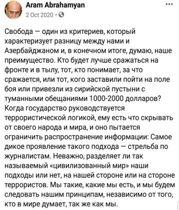 Aram Abrahamyan: “Freedom is one of the criteria that characterizes the difference between us and Azerbaijan and, ultimately, I think, is our advantage. Who will fight better at the front and in the rear, the one who understands what he is fighting for, or the one who was forced to go to the battlefield or brought from the Syrian desert with vague promises of 1000–2000 dollars? When a state is guided by a terrorist logic, it has something to hide from its people and the world, and it tries to limit the dissemination of information: