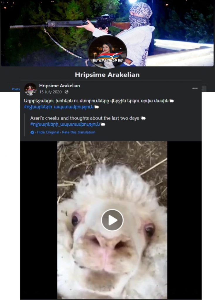 Khripsime Arakelyan, sharing a video reportage of Azerbaijanis, describes them as “sheep.”