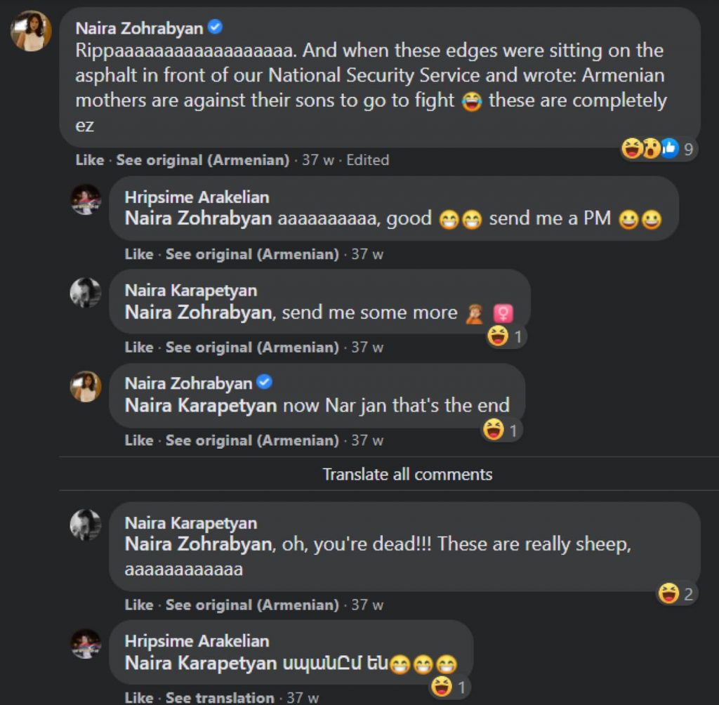 A member of the Armenian National Assembly from the “Prosperous Armenia” party sharing the status of Hripsime Arakelian (an excerpt from the new “Kill Dim” video, with a caption “go to sleep” and additional racist hashtags), writing in agreement: “That’s it.”