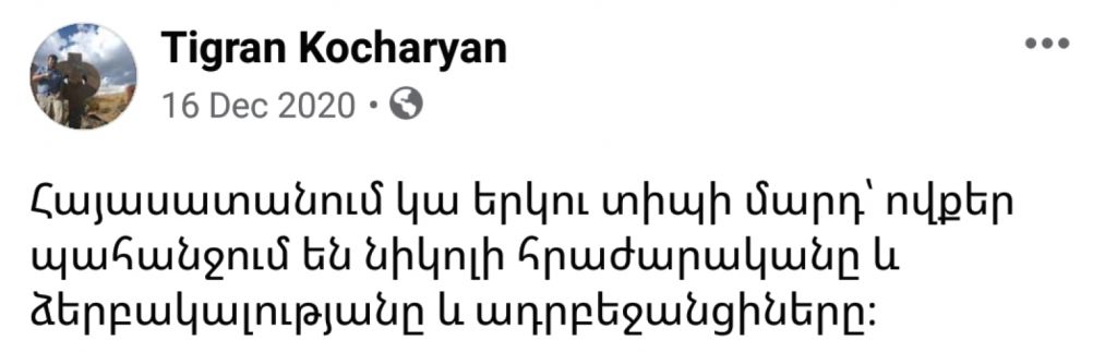 Tigran Kocharian: “There are two types of people in Armenia: those who demand either the resignation or the arrest of Pashinyan and the Azeris.”