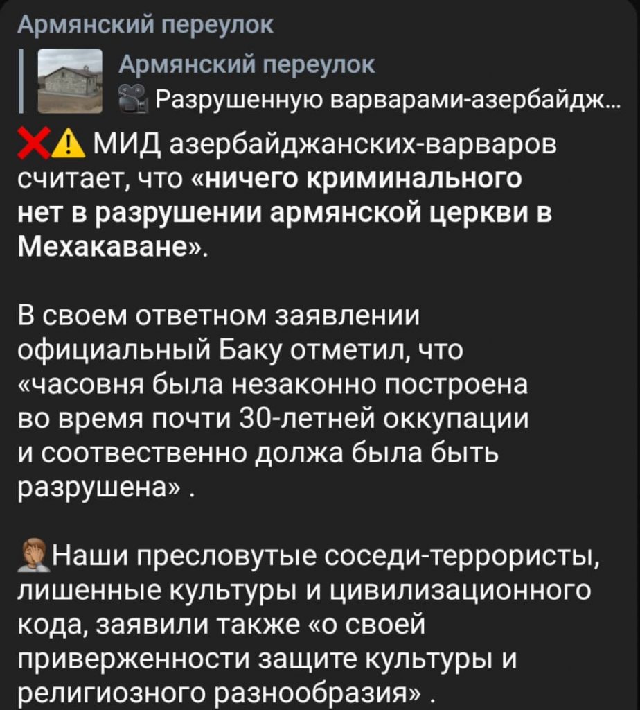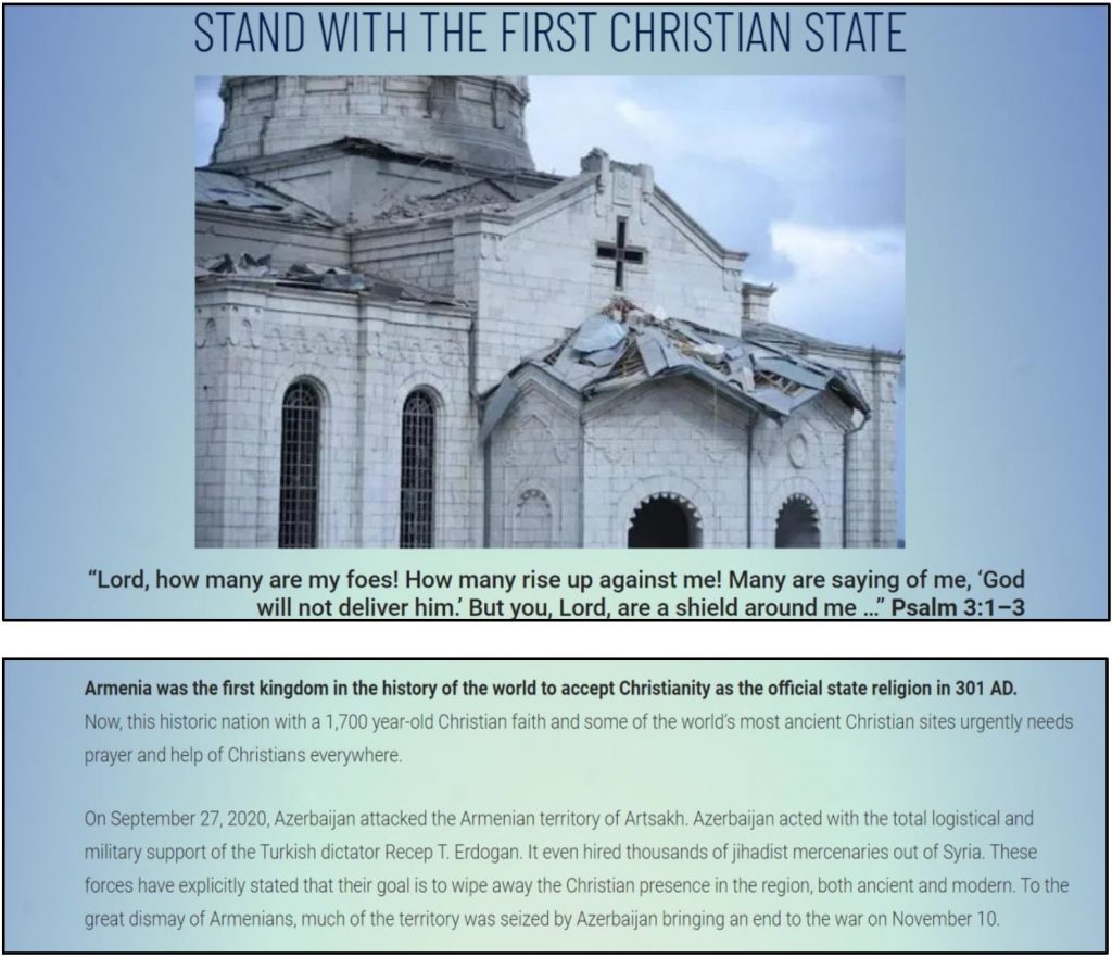 One of the most widespread narratives in the Armenian discourse is the attempt to link the war with religion. This narrative also gained wide traction in the Armenian diaspora, where representatives skillfully connect and use Christian fundamentalism to achieve their goals, as well as to create hostility against Azerbaijan and Azerbaijanis (especially given the difficult geopolitical situation in the world).