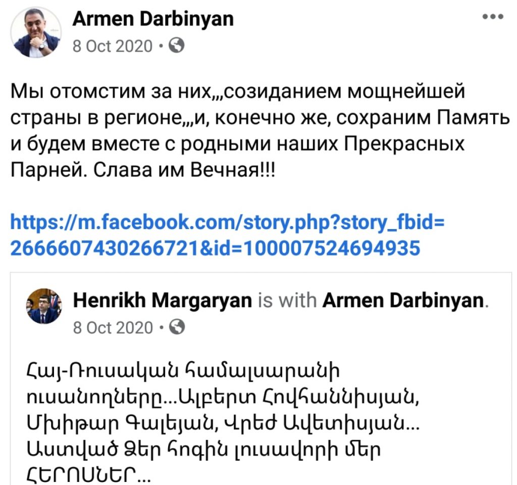 Armen Darbinyan shares the status of Henrikh Margaryan, where he lists the students of the Russian-Armenian University who died in the war, expressing hope and belief in future revenge for them.