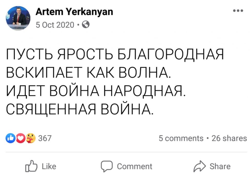 Artem Yerkanyan: “Let noble wrath boil over like a wave. This is the people’s war, a holy war.”