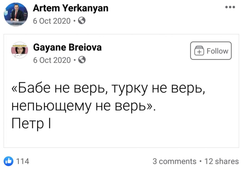 Artem Yerkanyan shares a status from Gayane Breiova: “Do not trust a woman, do not trust a Turk, and do not trust a non-drinker” (Peter I).