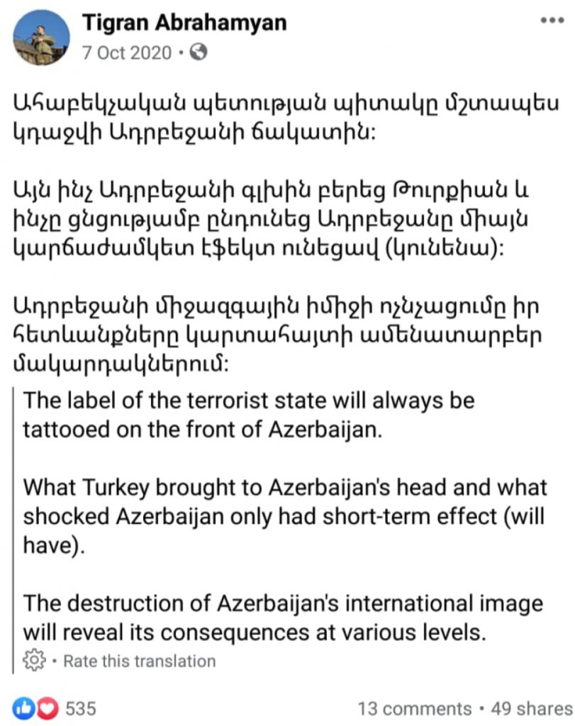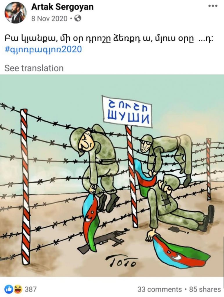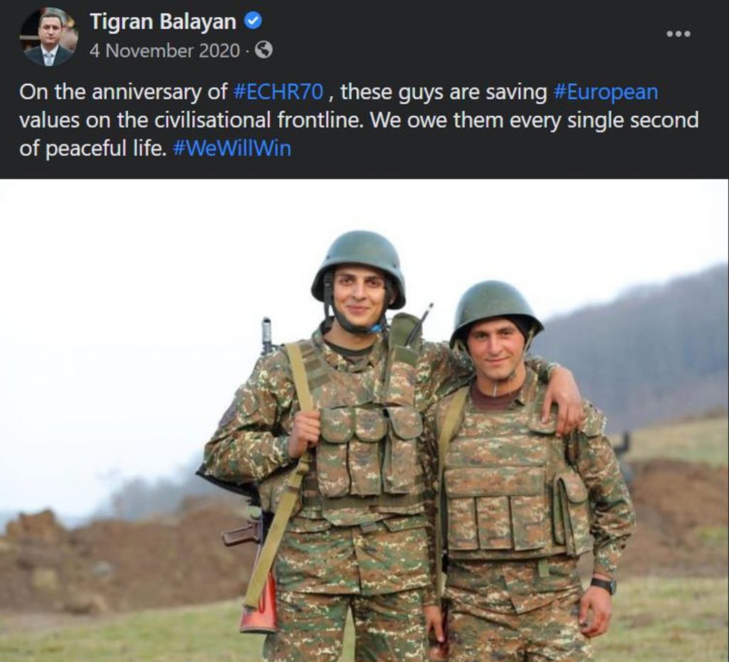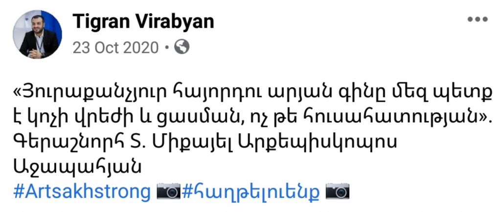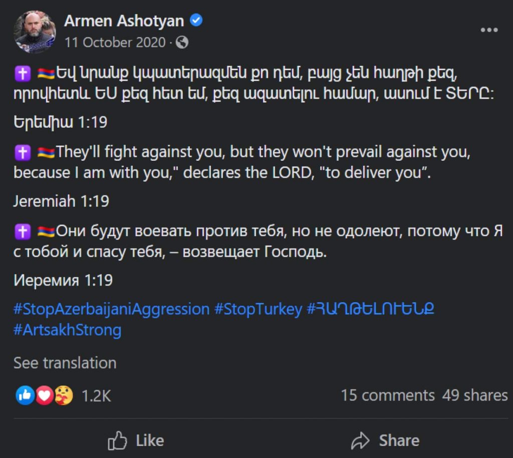 Former Minister of Education and Science of the Republic of Armenia, Vice-Chairman and Member of the Executive Council of the Republican Party of Armenia, Armen Ashotyan, shared excerpts from the Bible in three languages on his personal Facebook page during the war, in this way presenting the war as religious (God will help the Armenians , but will not help the devils – Azerbaijanis).