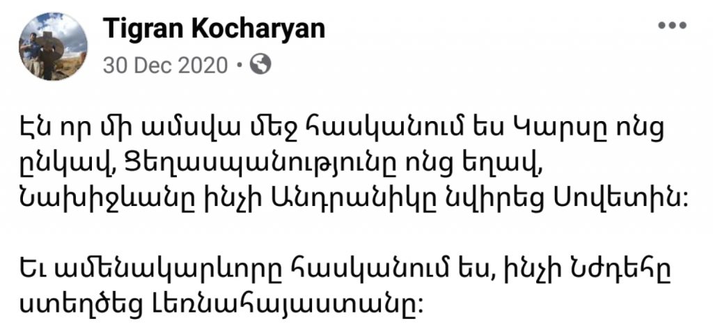 “When within a month you understand about Kars, how the genocide occurred, why Andranik presented Nakhchivan to the Soviet Union and the main part, you understand why Nzhdeh created the Republic of Mountainous Armenia.”
