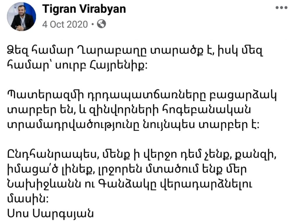 Tigran Virabyan: “For you, Karabakh is a territory, but for us, a holy homeland. The motives for the war are completely different, and the psychological attitude of the soldiers is also different. In general, we are not against the end, because we are seriously thinking about the return of our Nakhchivan and Gandzak [Ganja].”