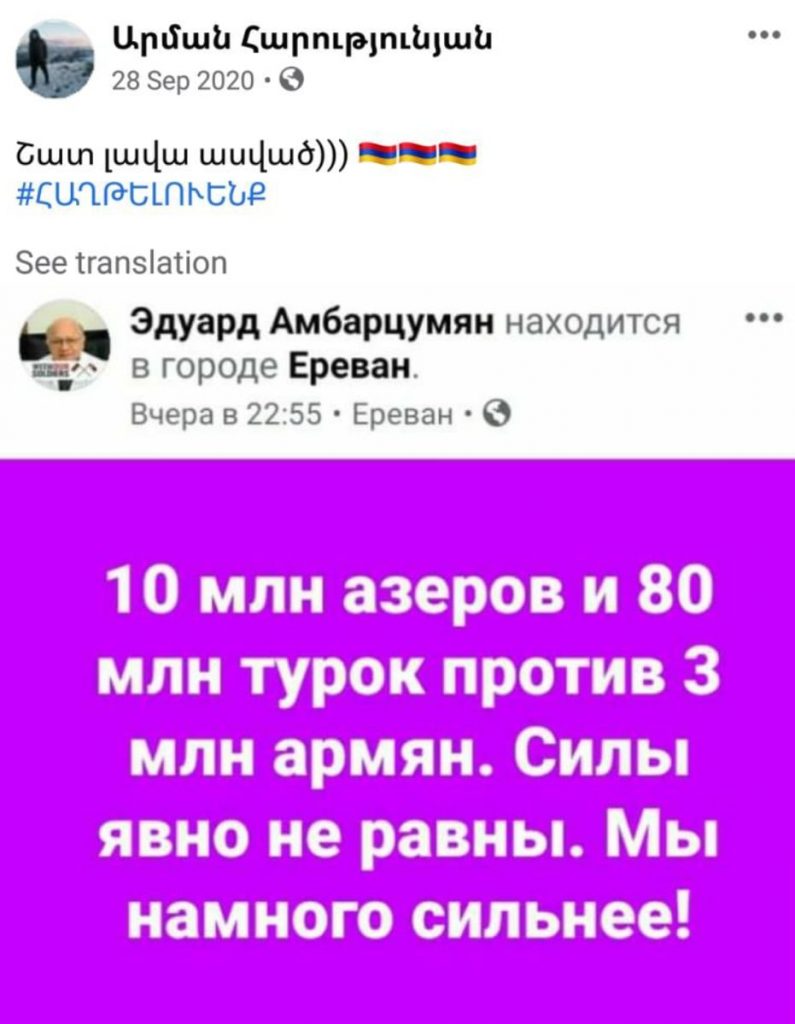 Arman Aratunyan: “Very well said,” sharing Eduard Ambartsumyan’s status: “10 million Azeris and 80 million Turks against 3 million Armenians. The forces are clearly not equal. We are much stronger!”
