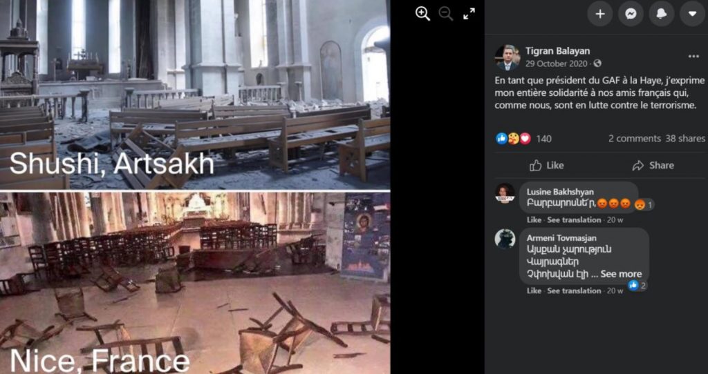 Diplomat Tigran Balayan: “As President of the Group of Francophone Ambassadors in The Hague, I express my complete solidarity with our French friends, who, like us, are fighting terrorism.” Despite the fact that in the recording Balayan focuses on the mutual fight against terrorism, he, at the same time, latently emphasizes the religious aspect, choosing and sharing images of churches.
