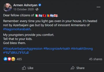 outcome. Armen Ashotyan made the following appeal to the countries to which Azerbaijan supplies gas: “Remember: every time you light the gas oven in your house, it’s heated not by Azerbaijani gas, but by the blood of innocent Armenians of Nagorno- Karabakh.”
