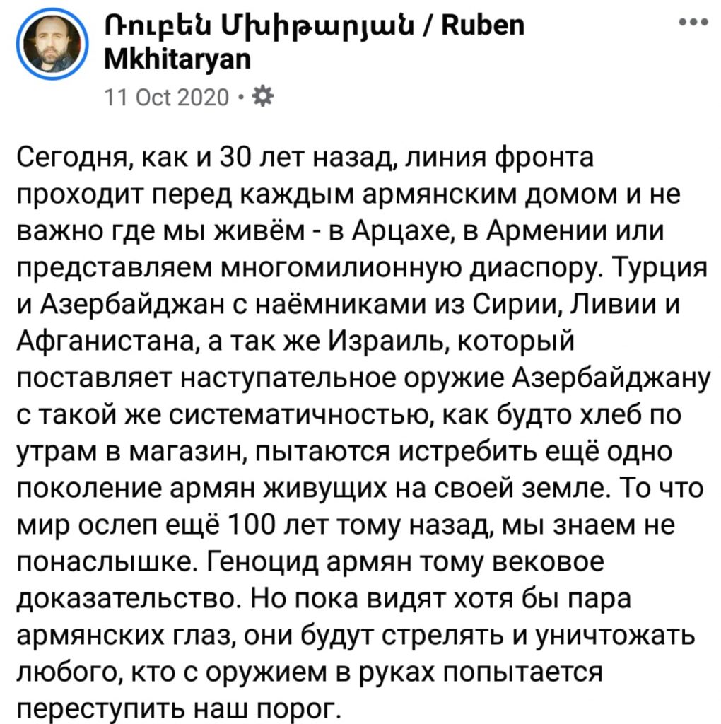 Ruben Mkhitaryan: “Today, just like 30 years ago, the front line passes in front of every Armenian house, and it doesn’t matter where we live—in Artsakh, in Armenia, or if we represent a multi-million diaspora. Turkey and Azerbaijan with mercenaries from Syria, Libya and Afghanistan, as well as Israel, which supplies weapons to Azerbaijan with