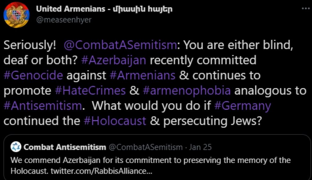 That is, in this case, the Azerbaijanis are so “uninformed, uneducated, and ignorant” that they do not understand the essence and do not follow the ceasefire agreement (in contrast to the “civilized, erudite, and cultural representatives of the highest race”: Armenians).