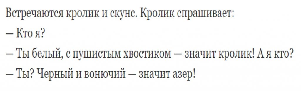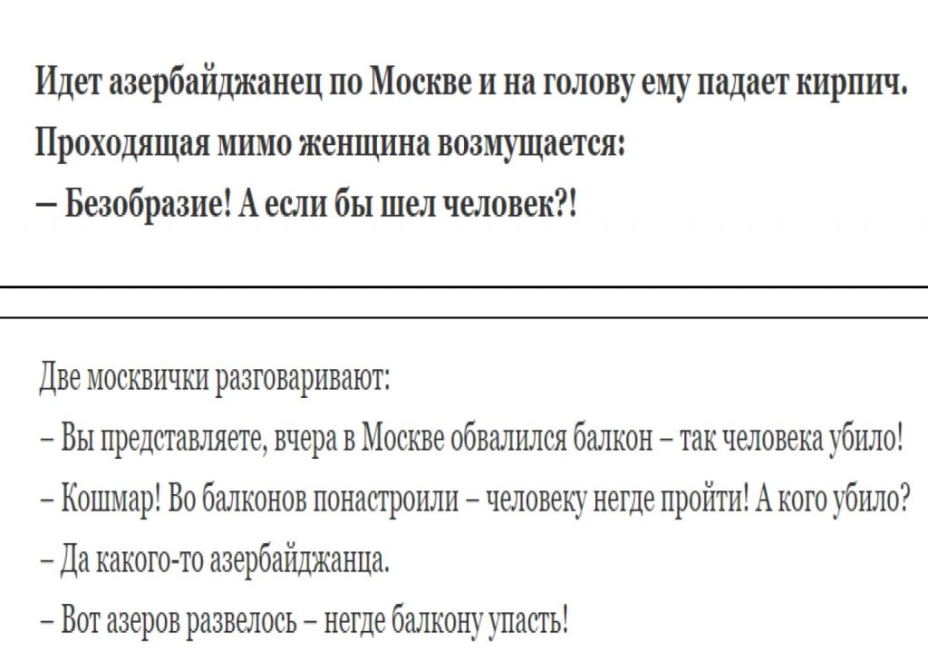 In the section “Azerbaijanis—non-humans,” the authors include a number of anecdotes that clearly express the essence of the above-described attitude of Armenians towards Azerbaijanis. In the following joke, for example, the ridicule is based on how a brick fell on the head of an Azerbaijani, and that an Azerbaijani is not a person at all: “— What an outrage! What if a human being was passing ?!” Similar content can be observed in the other anecdotes below.