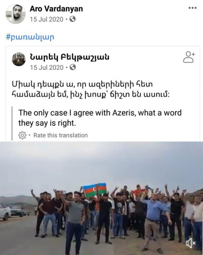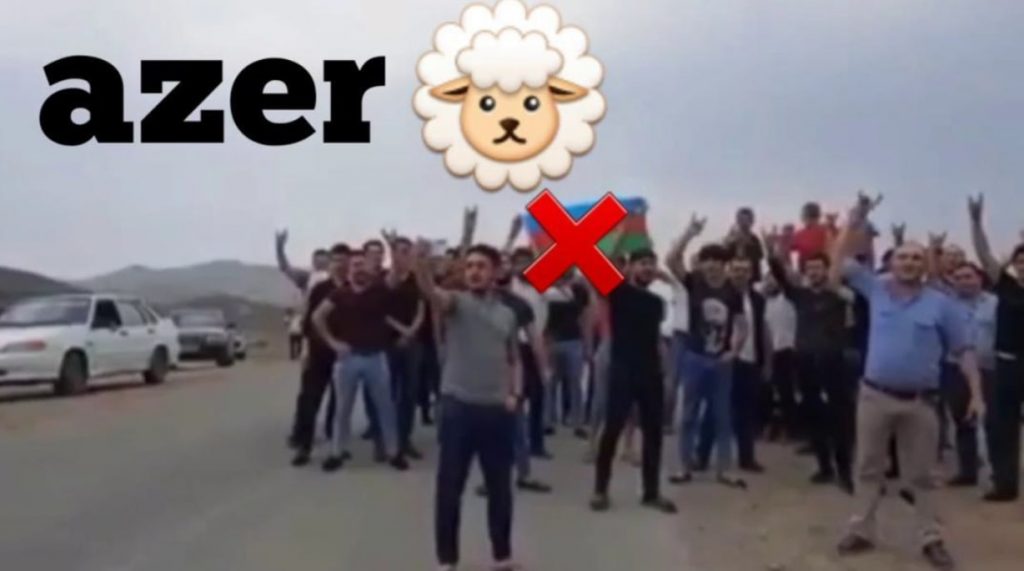 This video of Azerbaijanis protesting for Karabakh was re-dubbed by Armenians so that, instead of the protesters’ voices, screaming sheep voices were added. In the attached screenshot from Facebook, an Armenian user has shared this video, stating that this is the only case when he agrees with “Azeris” and that the words (meaning sheep noises) shouted by them are right.