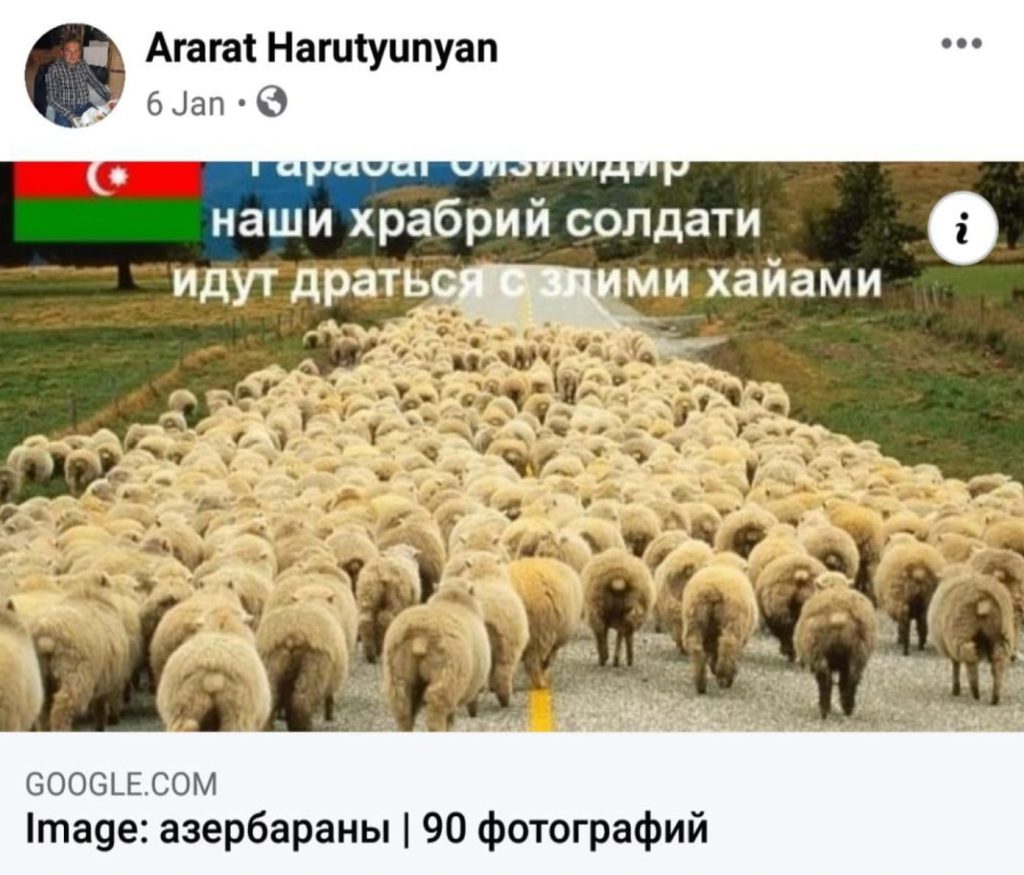 The next image, complementary to the first of “non-humans,” is the image of “sheep”— perhaps the most widespread image of Azerbaijanis among Armenians. Calling Azerbaijanis “sheep” is widespread across all strata of Armenian society, that is, this narrative can be stumbled upon everywhere in the Armenian media. Below are materials collected from different videos and social media posts. The bottom line is that, regardless of the unconditional propaganda from the authorities, dehumanization and hate speech are already embedded in the minds of Armenians without needing the frequent maintenance of the “enemy narrative.” The first Karabakh war further strengthened the self-esteem and self-confidence of the Armenians, after which the emphasis was placed on how “uneducated, weak, stupid, and ignorant barbarians Azerbaranians who cannot fight” are.