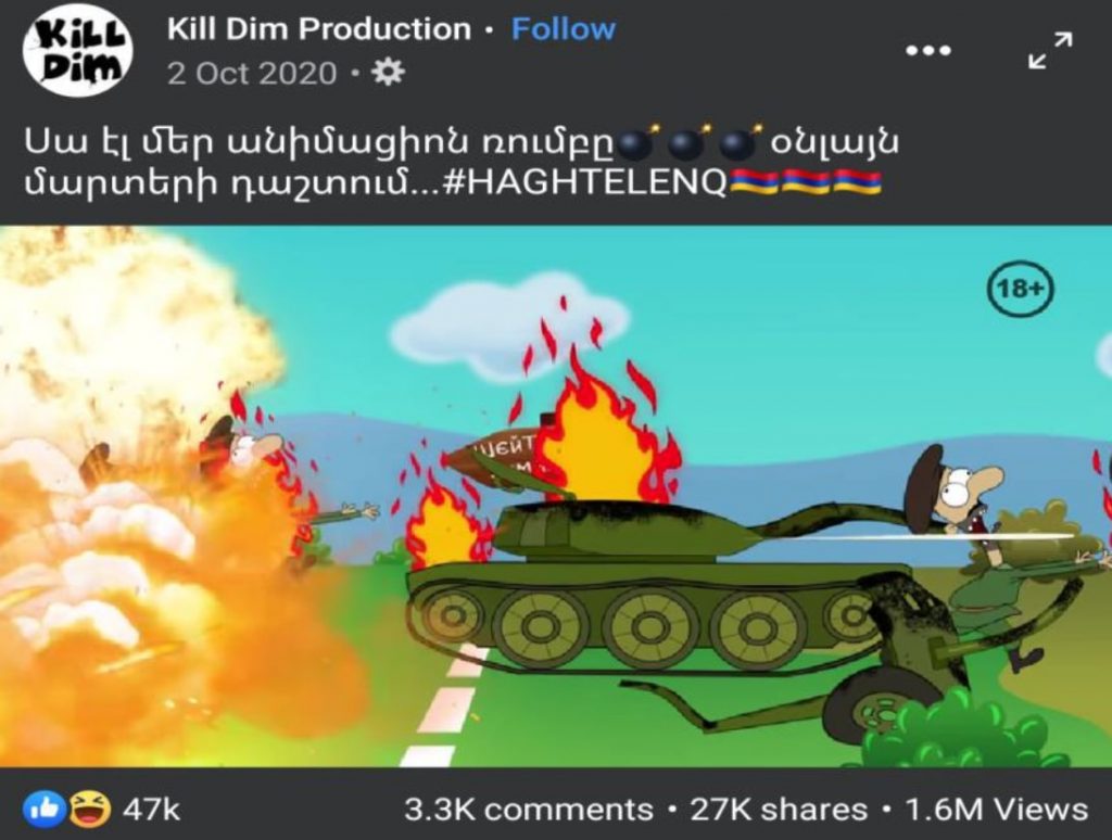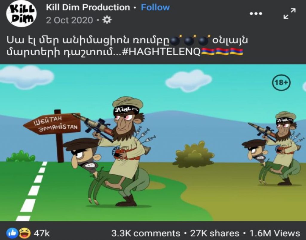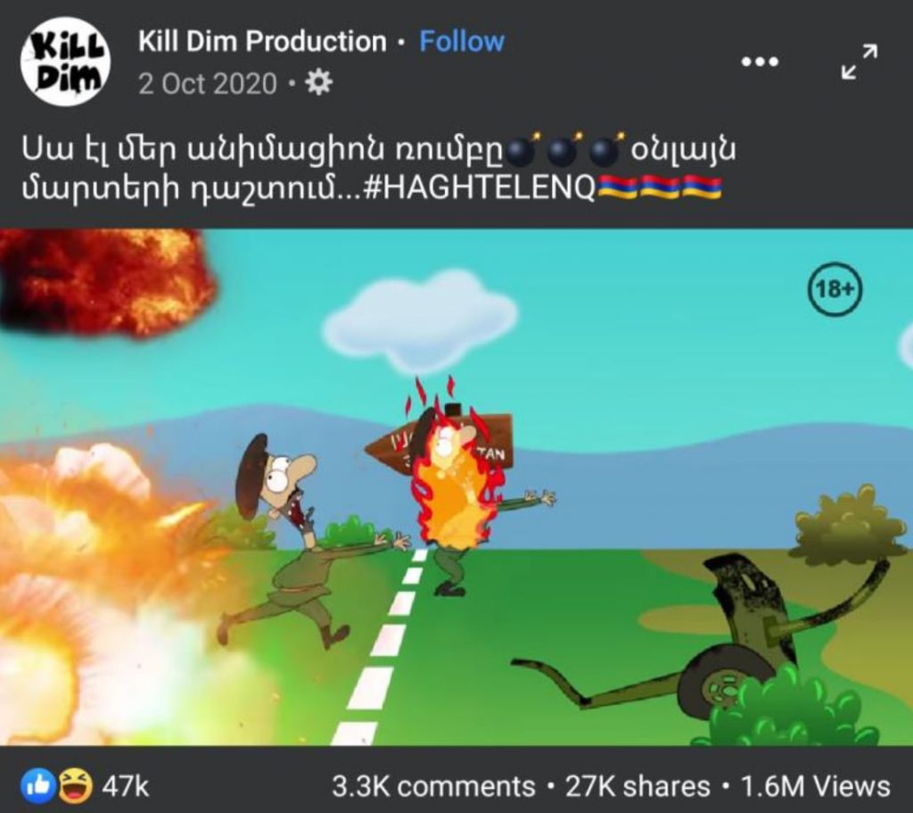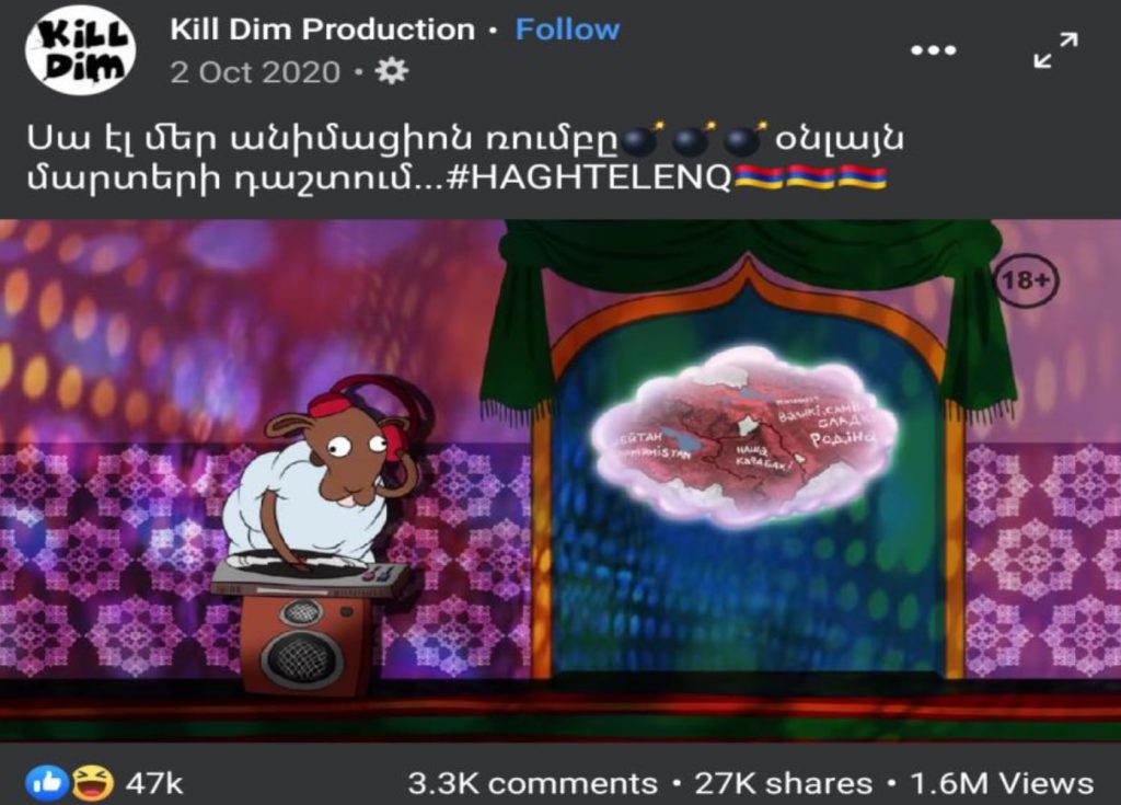 Kill Dim Production—an animation studio filming satirical cartoons about Armenian and Azerbaijani soldiers on the front lines—openly expressed xenophobic sentiments against Azerbaijanis with extremely racist content. The Armenians themselves describe the animated series as “a cartoon about the stupidity of an Azerbaijani soldier who finds himself in all sorts of funny situations due to the preparation of his government.” The Azerbaijanis in the cartoon are shown, among other things, in the form of “sheep.”