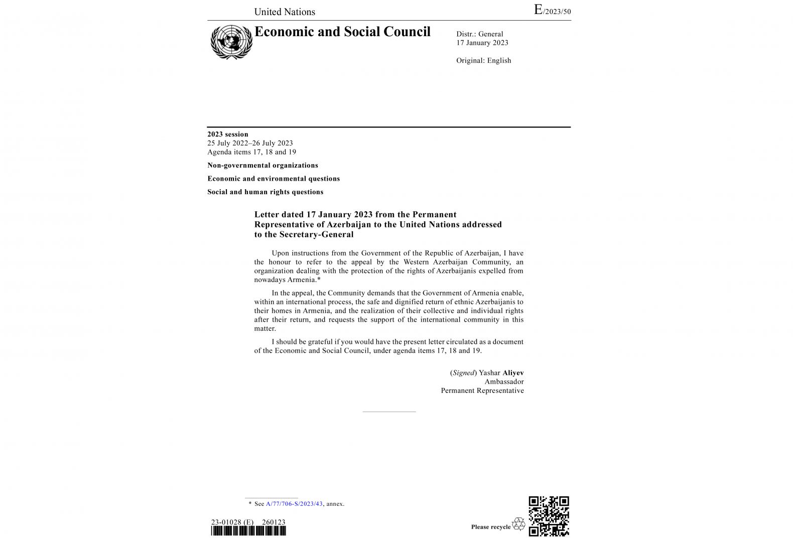 Appeal of the Western Azerbaijan Community circulated as official UN document
