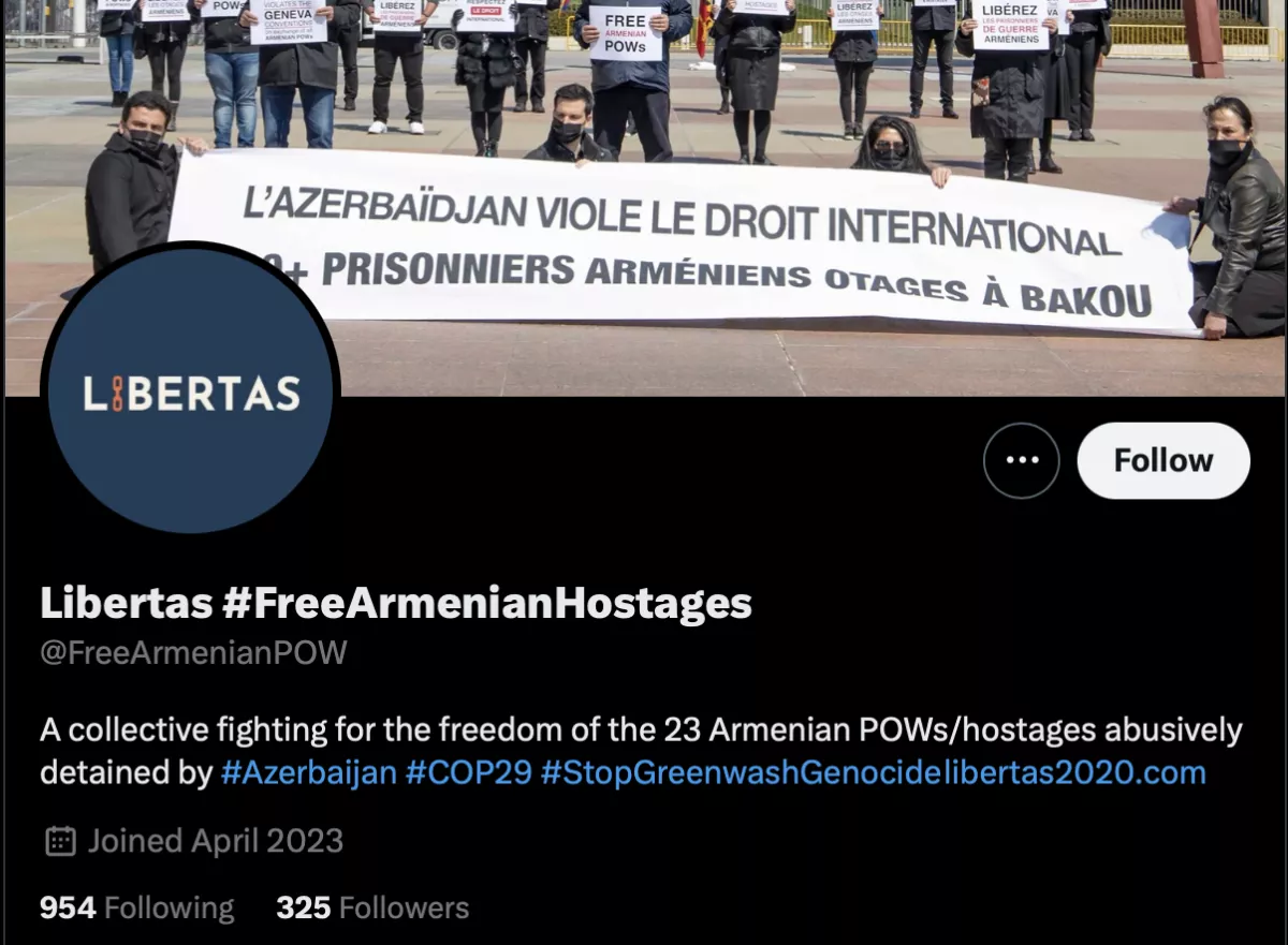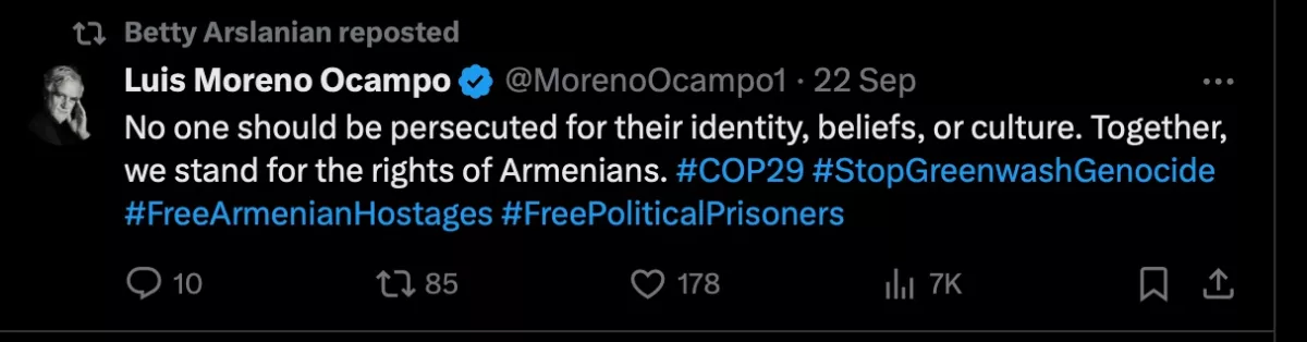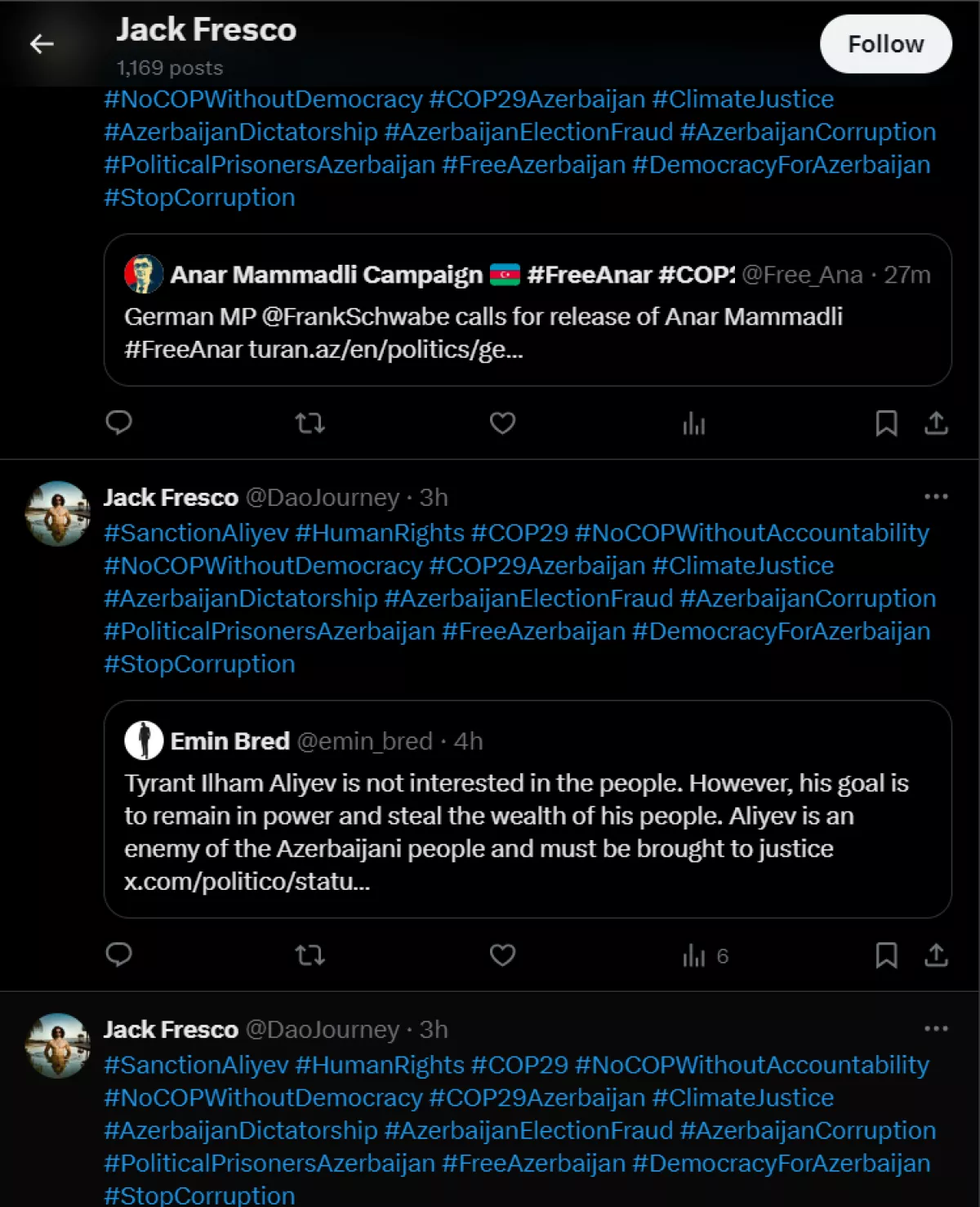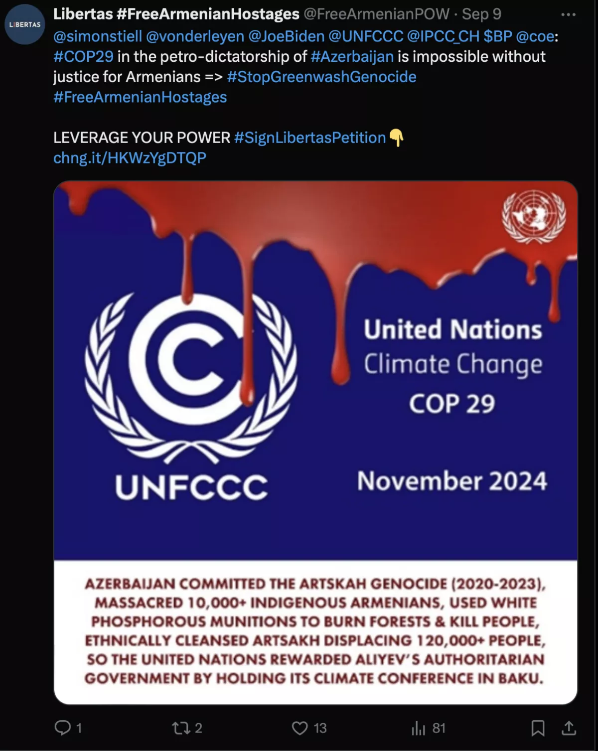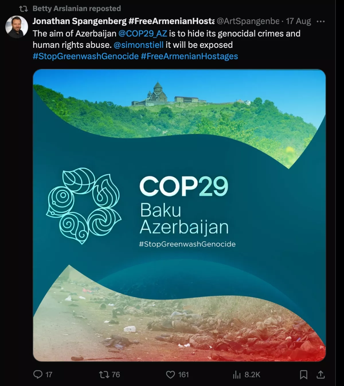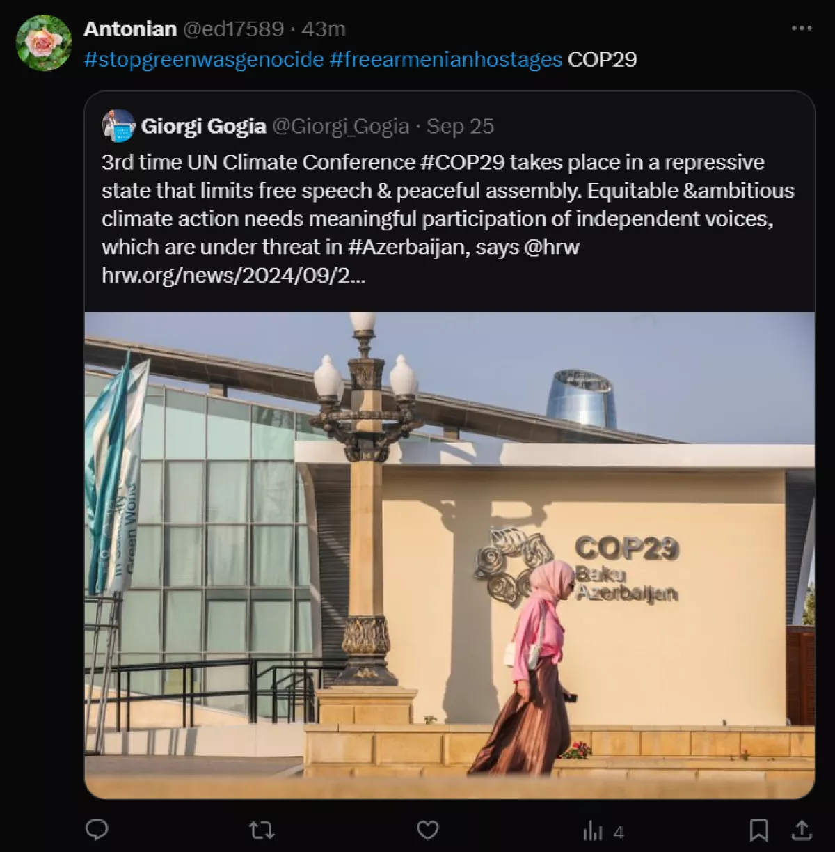 In pursuing this goal, the participants of the black propaganda are using the main branded hashtag of the event, #COP29, and have added their own hashtags: #StopGreenwashGenocide, #FreeArmenianHostages, #FreePoliticalPrisoners.