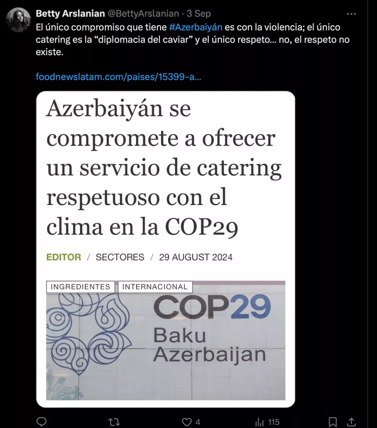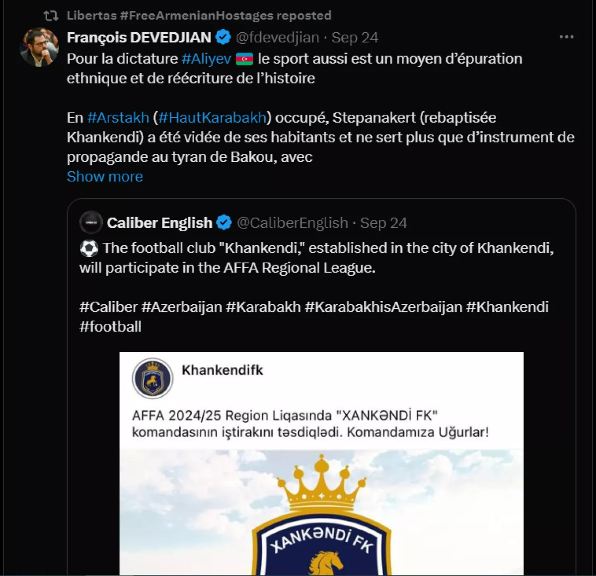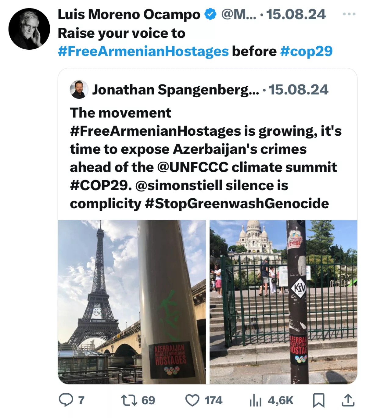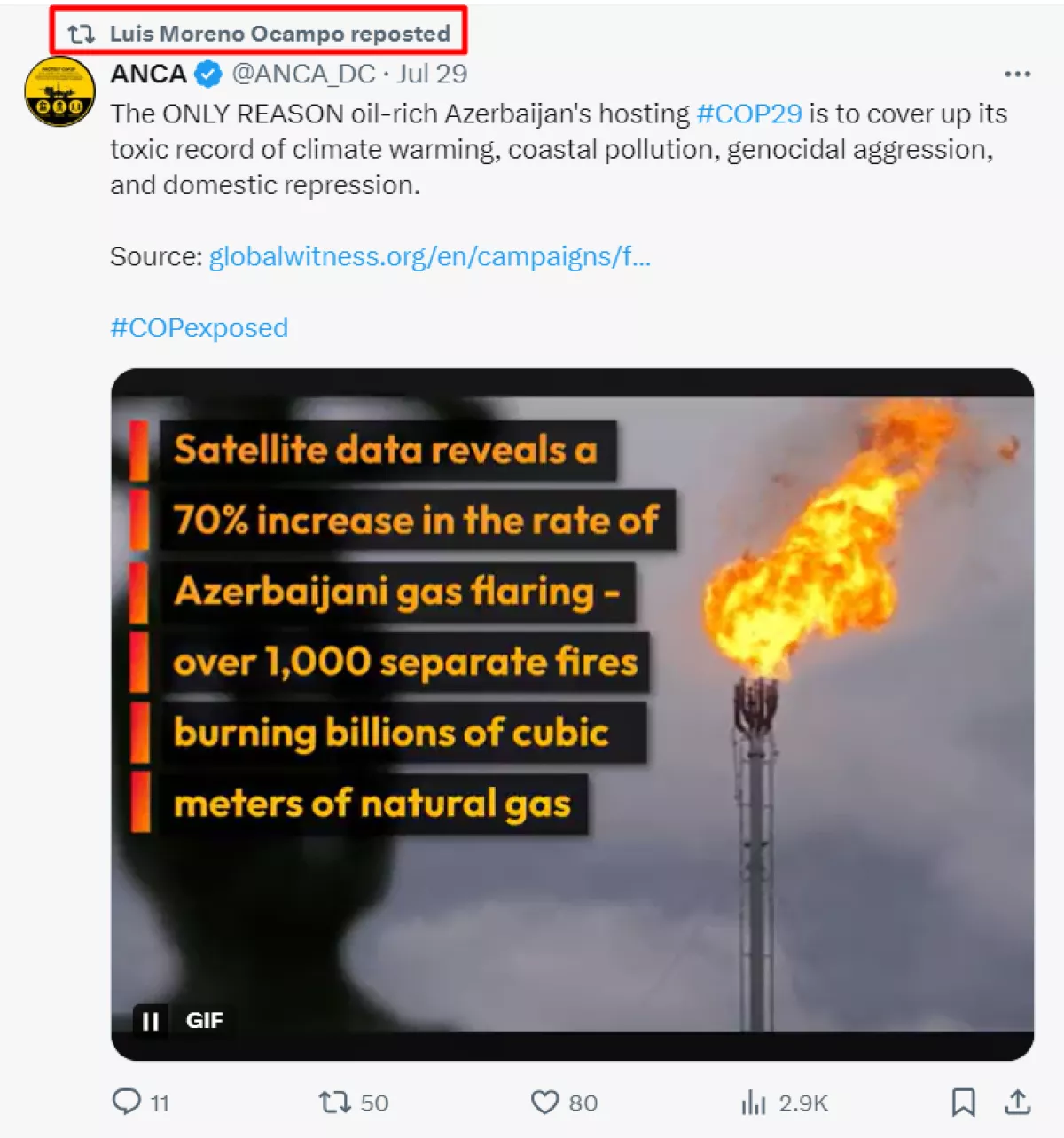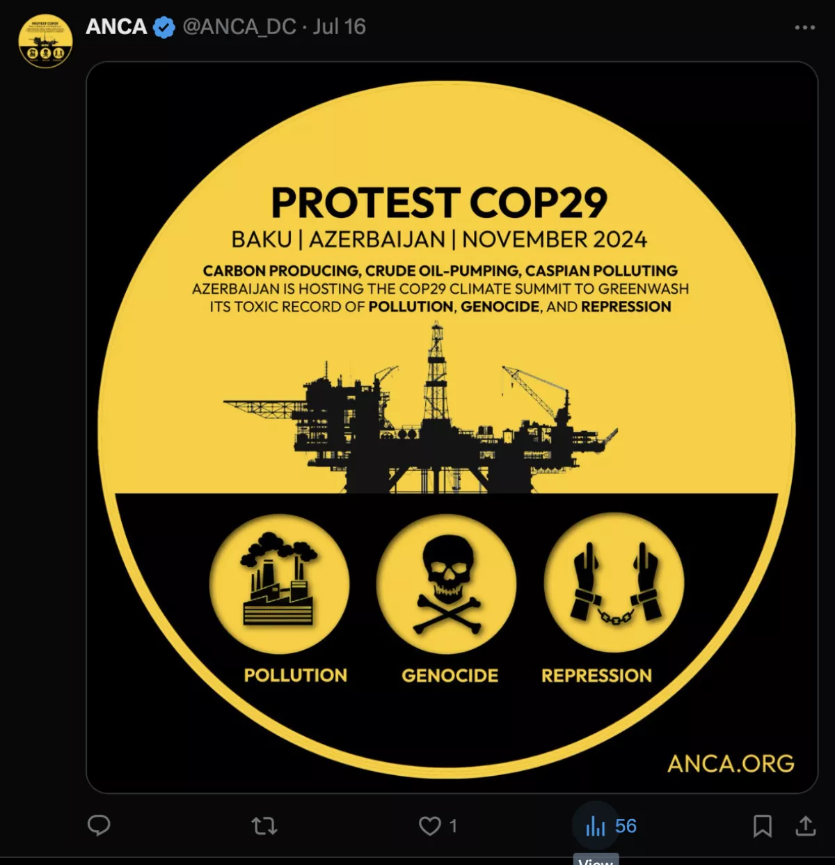 In pursuing this goal, the participants of the black propaganda are using the main branded hashtag of the event, #COP29, and have added their own hashtags: #StopGreenwashGenocide, #FreeArmenianHostages, #FreePoliticalPrisoners.