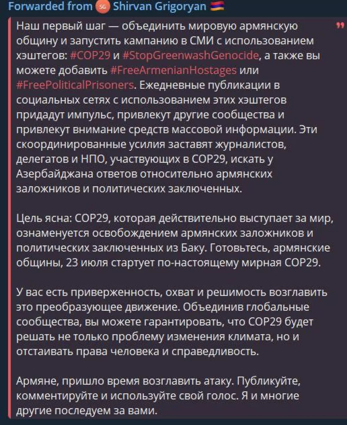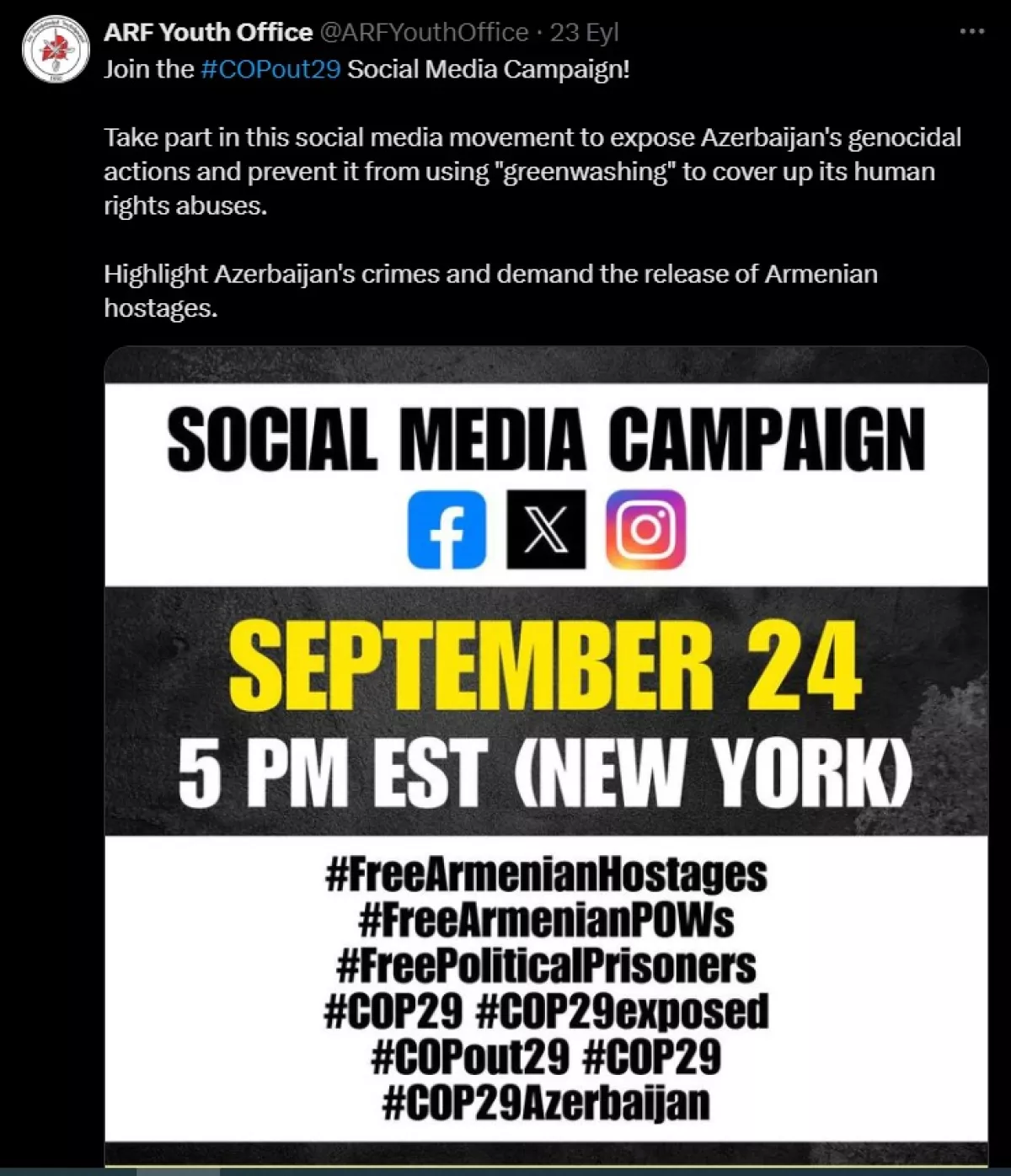 Moreover, information is available on the X account of the youth wing of the Dashnaktsutyun party detailing the date, time, materials, and hashtags that should be shared. Additionally, it was found that a Telegram message containing instructions for the campaign against COP29 was circulated among Armenian users. This guide mentioned the main hashtags for the COP29 campaign, the start date, and the primary objective.