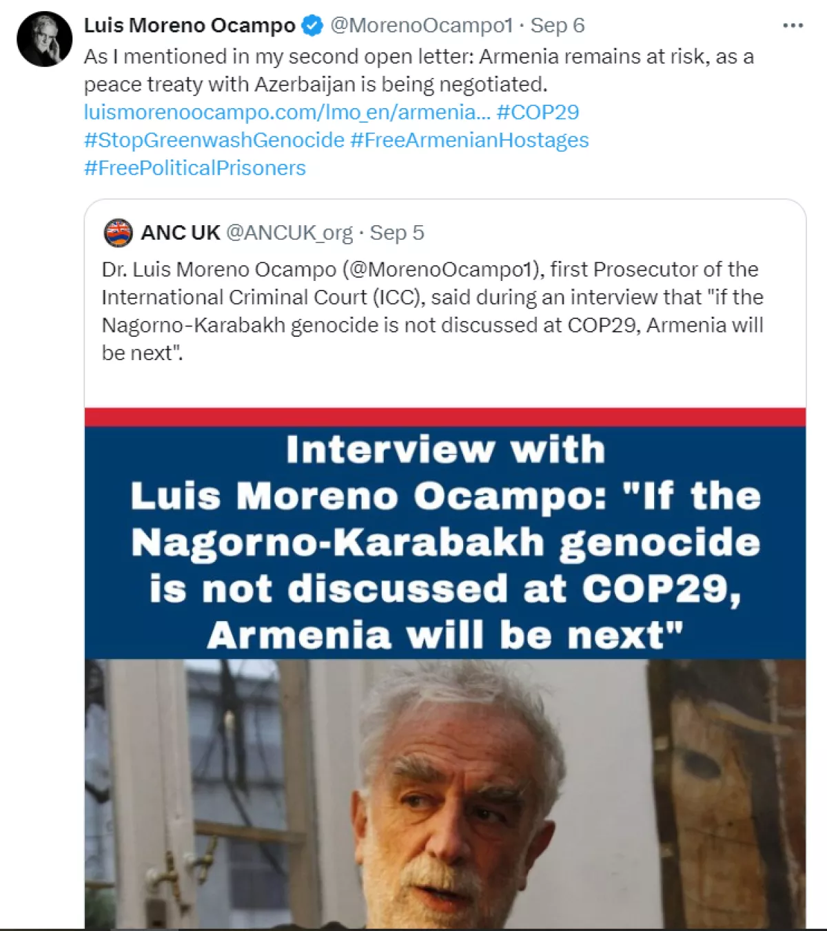 As the main media mouthpiece hired by the global Armenian community to spread anti-Azerbaijani propaganda, we have a personality already well-known to our users—former prosecutor of the International Criminal Court, Luis Moreno Ocampo. In an exclusive interview given to Armenianweekly.com on September 6, 2024, Ocampo admitted that three prominent representatives of the Armenian diaspora in Argentina—Judge Leon Carlos Arslanian, sociologist Juan Gabriel Tokatlian, and the vice-president of the Socialist International, Mario Nalpatian—invited him to collaborate in the summer of 2023. To be precise, it was Nalpatian who called him and asked what he could do for “Nagorno-Karabakh.” A typical beginning for a business conversation, isn’t it? However, Ocampo did not disclose the amount that this brave trio offered him. It is worth noting that as part of the anti-Azerbaijani activities that began at that time, Ocampo produced a completely false report about the alleged “genocide of the Armenian population” occurring in the Karabakh region of Azerbaijan.