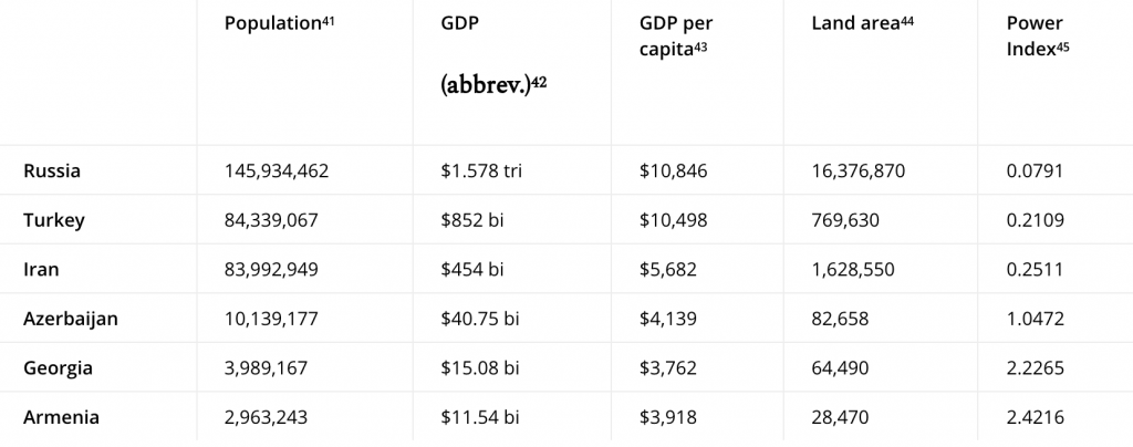 Therefore, having defined the South Caucasus as the region to be explored and, on the basis of the relevant literature, setting Russia, Turkey, and Iran in a line above the South Caucasus, it is important to observe the attributes of these countries to compare the extent to which Azerbaijan could be placed as a leader of the South Caucasus region.