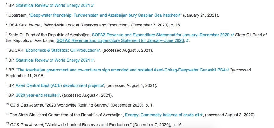 Azerbaijan’s proved crude oil reserves were estimated at 7 billion barrels in January 2021, according to the Oil & Gas Journal (OGJ).3
