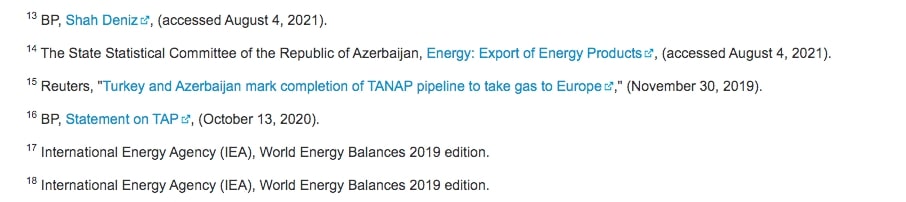 ‘The TANAP makes up the longest stretch of the Southern Gas Corridor, carrying gas from Azerbaijan’s Shah Deniz II field to Europe.15 In 2020, the majority of Azerbaijan’s natural gas was exported to Turkey and Georgia with a lesser volume exported to Iran and Greece.