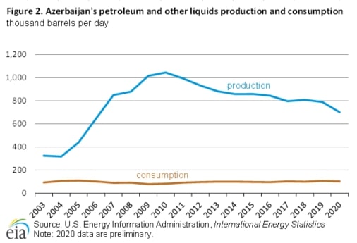 In 2020, Azerbaijan’s petroleum and other liquids production was an estimated 716,000 barrels per day (b/d) of which domestic use averaged about 92,000 b/d (Figure 2).6