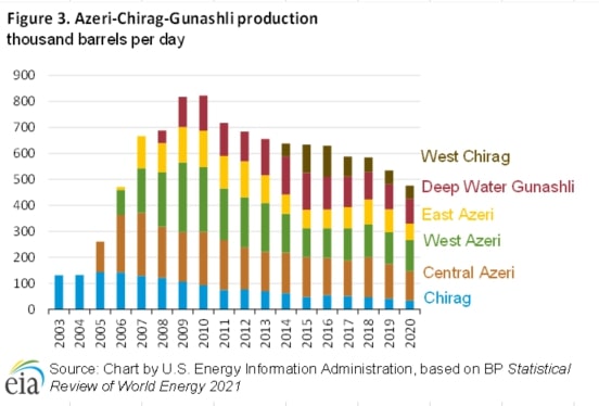 In 2020, more than 67% of Azerbaijan’s total oil output–about 477,000 b/d–came from the ACG fields, down from 535,000 b/d in 2019 (Figure 3).