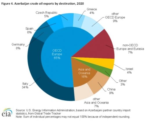 Azerbaijan’s crude oil exports were about 568,000 b/d in 2020 (Figure 4).11 Most of the exports were destined for European countries, with Italy receiving 34% of Azerbaijan’s crude oil exports in 2020.