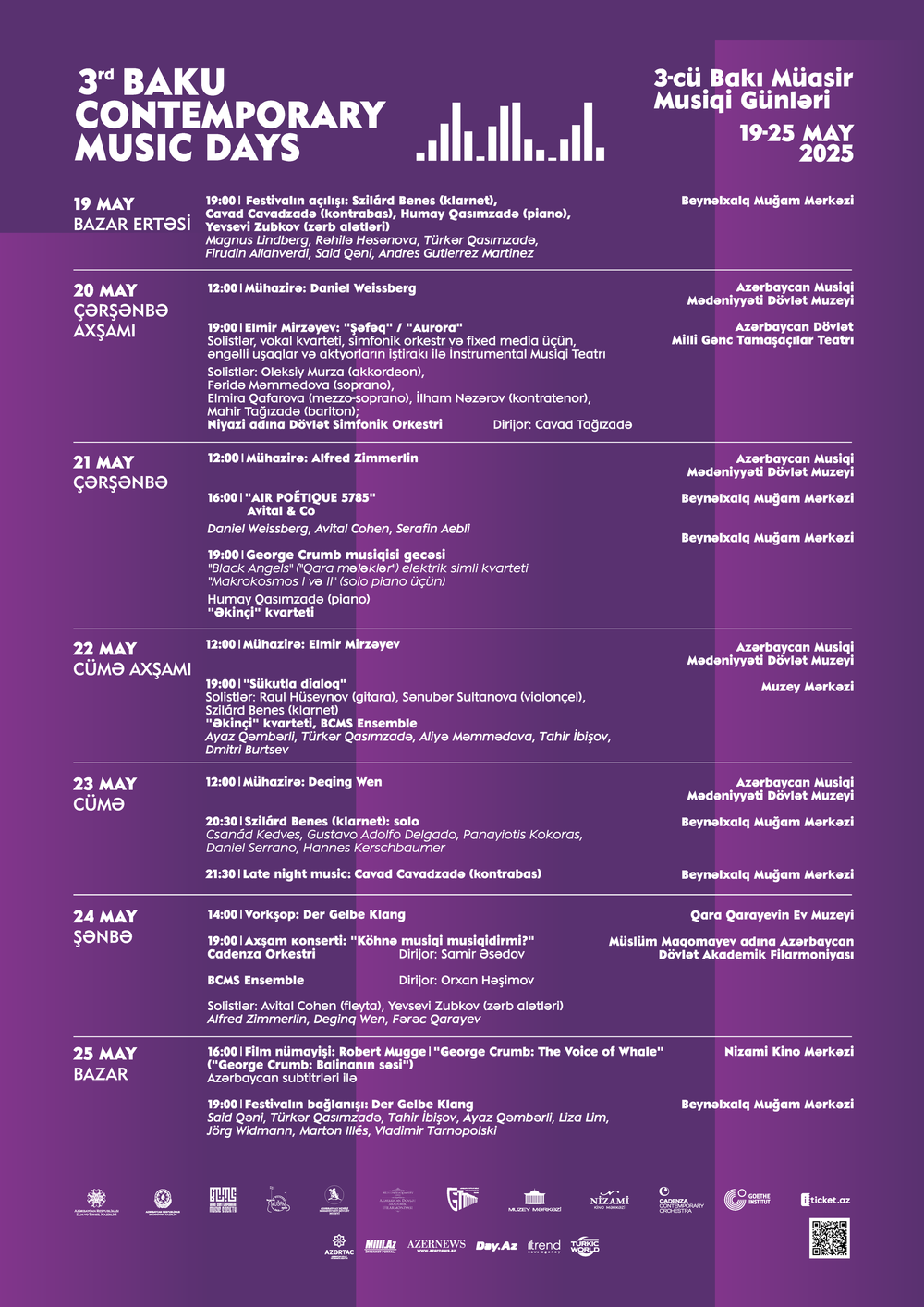 The festival program comprises morning, afternoon, and evening sessions and is open to the public. Events will take place across leading cultural and concert venues in Baku, including the State Museum of Azerbaijani Musical Culture, the Gara Garayev House Museum, the Museum Center, the International Mugham Center, the Azerbaijan State Academic Philharmonic Hall, the Azerbaijan State National Theatre of Young Spectators, and the Nizami Cinema Center. These venues will host not only evening concerts but also workshops and lectures accessible to both professional musicians and anyone interested in contemporary music.