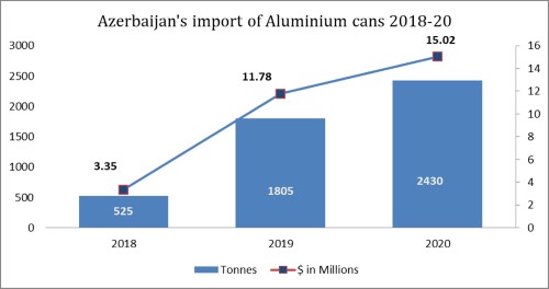 In 2018, Azerbaijan’s import of aluminium cans was accounted for 525 tonnes only and the expenditure stated was $3.35 million, whereas, in 2019, the import reflected a robust growth of 243.80%, as the import volume rose more than threefold time from the previous year to 1805 tonnes and the also jumped to $11.78 million.