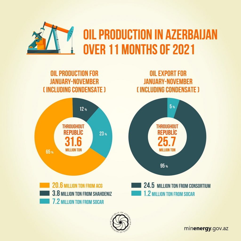 Azerbaijan’s Ministry of Energy revealed in its report that SOCAR’s oil output amounted to 7.2 million tons (including condensate) for the past 11 months, while the volume of exported oil, including condensate, amounted to 25.7 million tons. Out of this, consortium accounts for nearly 24.5 million tons and SOCAR for more than 1.2 thousand tons.