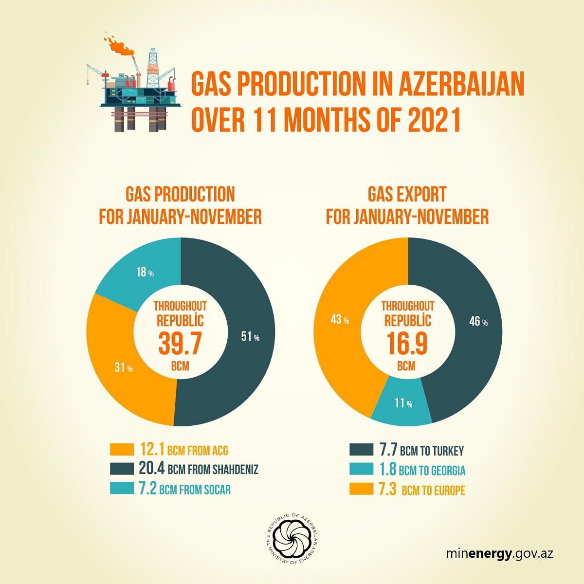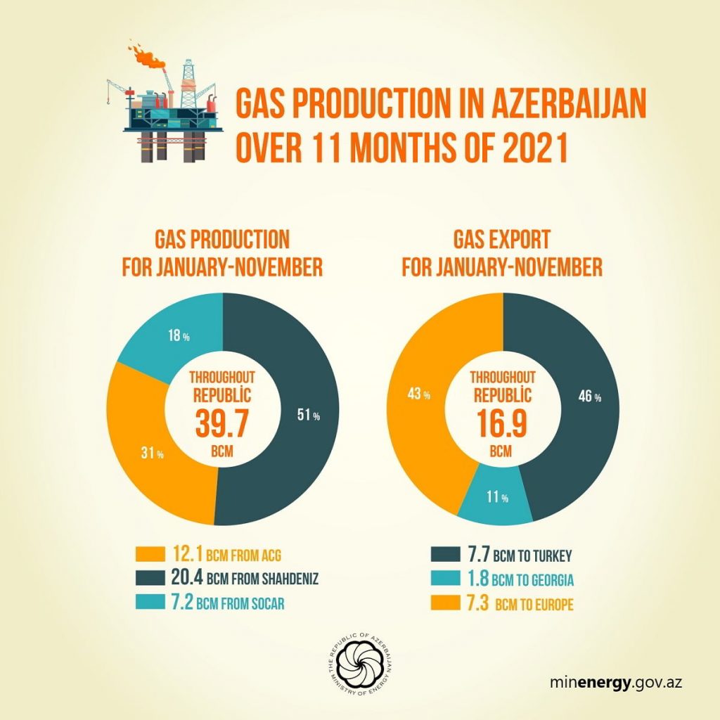 During the same period, more than 188.7 bcm of gas was extracted from Azeri-Chirag-Gunashli and more than 153 bcm from Shah Deniz, while more than 106.2 bcm of gas was exported from Shah Deniz.
