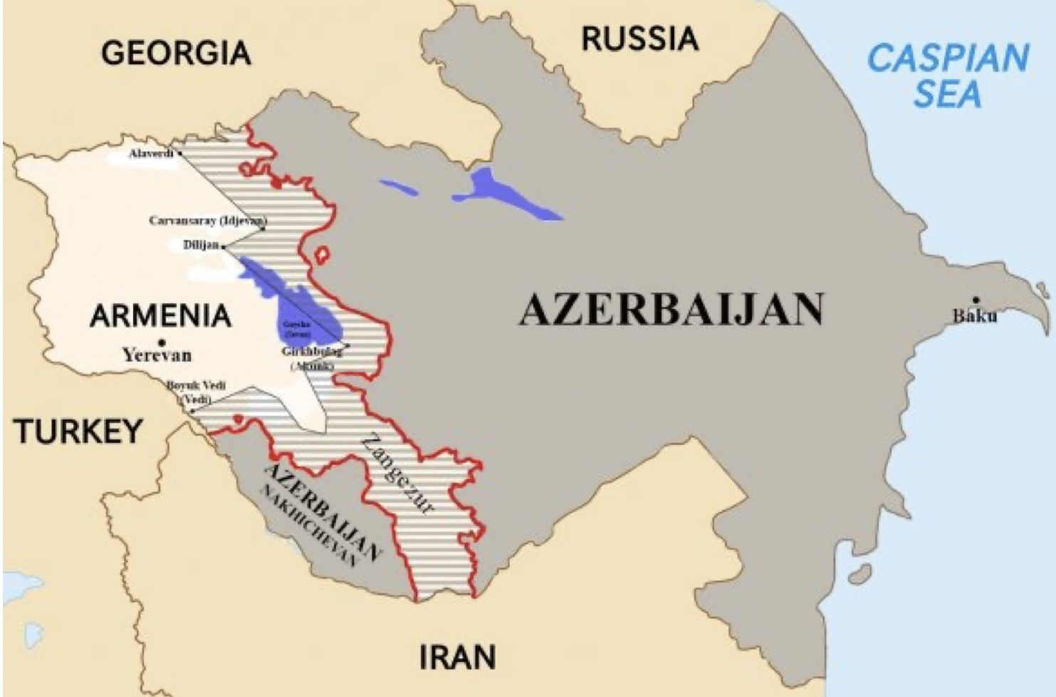 Therefore, in my opinion, Azerbaijan should be ready to introduce and establish a “security belt” if the processes in Armenia follow a dangerous scenario and there is a threat to our borders and population of the border regions. Since military attacks on Azerbaijan took place and are taking place not only in Karabakh, but along our entire border as well, as exemplified by the attacks on Tovuz in July 2020, as well as the fact that 7 villages in Qazakh District and the village of Kyarki in the Nakhchivan Autonomous Republic remain under occupation, a “security belt” is essential. It should cover the entire length of the Armenian-Azerbaijani border and the territory about 30 km deep into Armenia. Only in this way will we be able to keep our borders and residents of our border regions safe from Armenian artillery systems. By my estimation, the border of the “security belt” should pass along the line of the settlements of Alaverdi in the Qazakh section, Carvansaray (Ijevan), Dilijan, the middle line of Lake Goycha (Sevan), then through Girkhbulag (Akunk), Boyuk Vedi (in the Nakhchivan section) completely covering Western Zangezur because this wedge is narrow. You can see it on the map drawn by our Center.