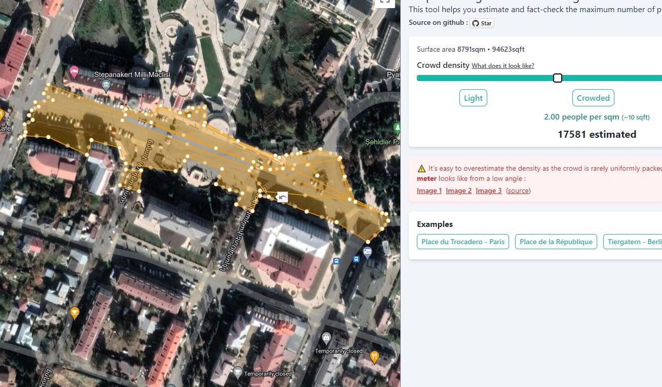 To count the number of people that were involved in the rally, on the Mapcheking application contours were added to the perimeter of the area that hosted the action on the square in Khankendi. Based on photos and videos, it was found that the density at the right and left edges of the square is very low (0.7 people per sq. km), given the length of 220 metres and the width of 7 metres of rags brought to the square and the space in front of the podium, and also based on the fact that there are an average of two people per square meter, we entered these data into the Mapcheking application. The result was 17,581 people.