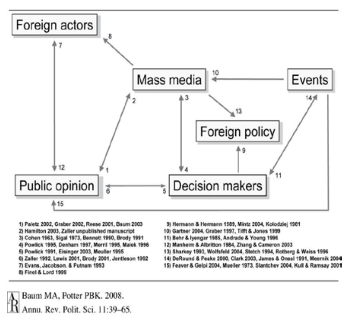 Baum, M.A. and Potter, P.B., 2008. The relationships between mass media, public opinion, and foreign policy: Toward a theoretical synthesis. Annu. Rev. Polit. Sci., 11, pp.39-65.