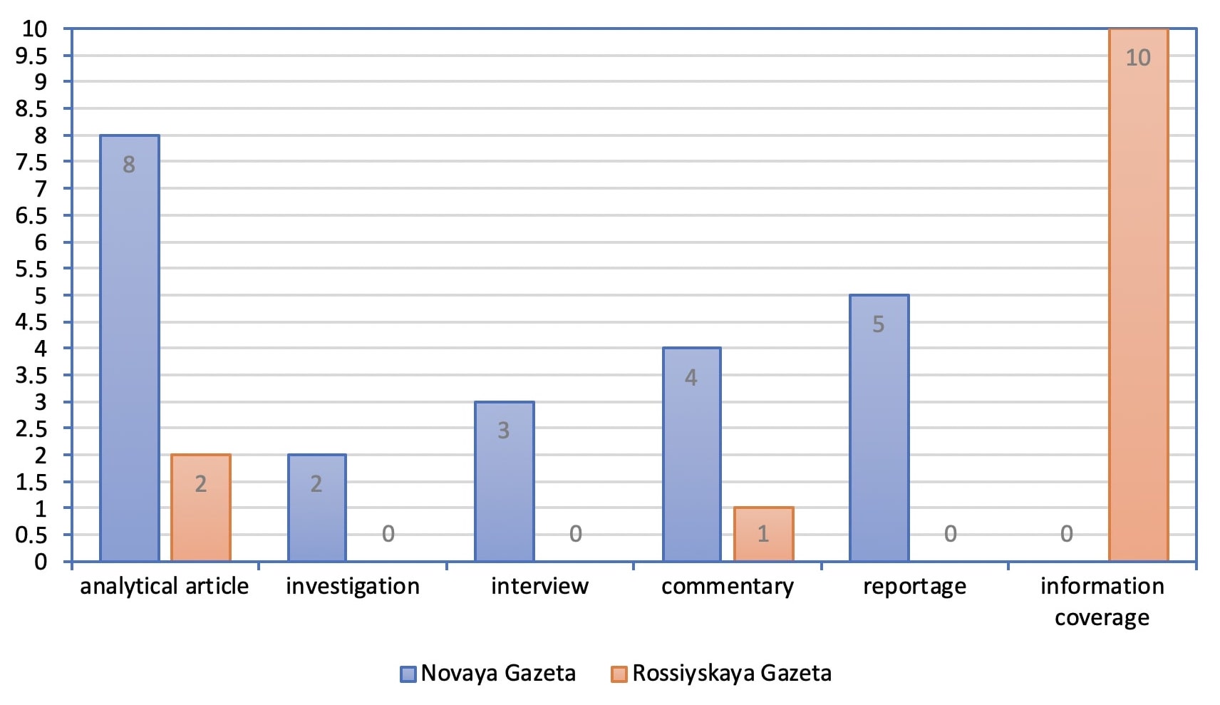 Fig. 2. Distribution of materials in Rossiyskaya Gazeta and Novaya Gazeta by genre