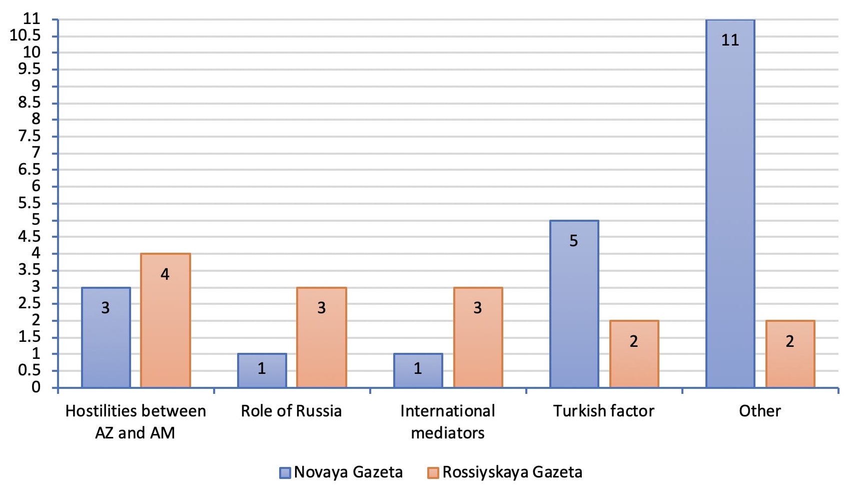 The purpose of this paper is to identify the possibility of covering the war between Armenia and Azerbaijan in the context of the above theories without raising the issue of a specific impact on the audience. The author has tried to analyze the differences in media approaches by examining the presence and prevalence of various attributes (topics and subtopics) and frames. The proposed study is the first attempt at a comparative analysis of the specifics of coverage of the war between Armenia and Azerbaijan by two high-quality publications—Novaya Gazeta and Rossiyskaya Gazeta.